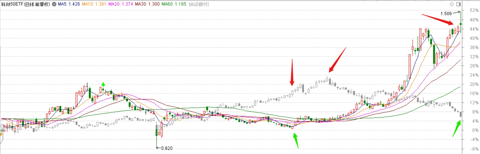 主图是科创50ETF,附图用了中证银行指数。