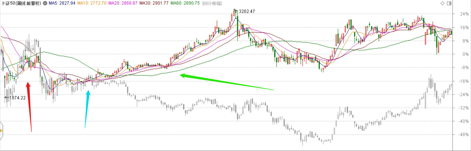 红色箭头区域是2015年股灾2.0的反弹和2016年初3.0熔断表现,蓝色箭头是灾后重建修复过程。这两部分的指数基本是同向的。分歧在绿色箭头区域发生了。有交易经历的投资者现在都明白,这一段历史的背景叫“供给侧改革”,实际就是“去产能”,和我们当前的“反内卷”完全类似。这个阶段我们看图可知,以大盘蓝筹股为代表的上证50走出了媲美美国漂亮50的走势,而创业板由于2015年暴涨暴跌后,元气大伤,在挤压泡沫的过程里长期处于跌跌不休的状态。因此当时媒体概括为“漂亮50要命3000”行情。指数分化的格局一直到2019年初新一轮牛市启动才被打破。