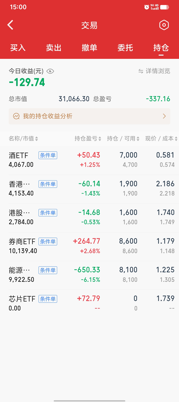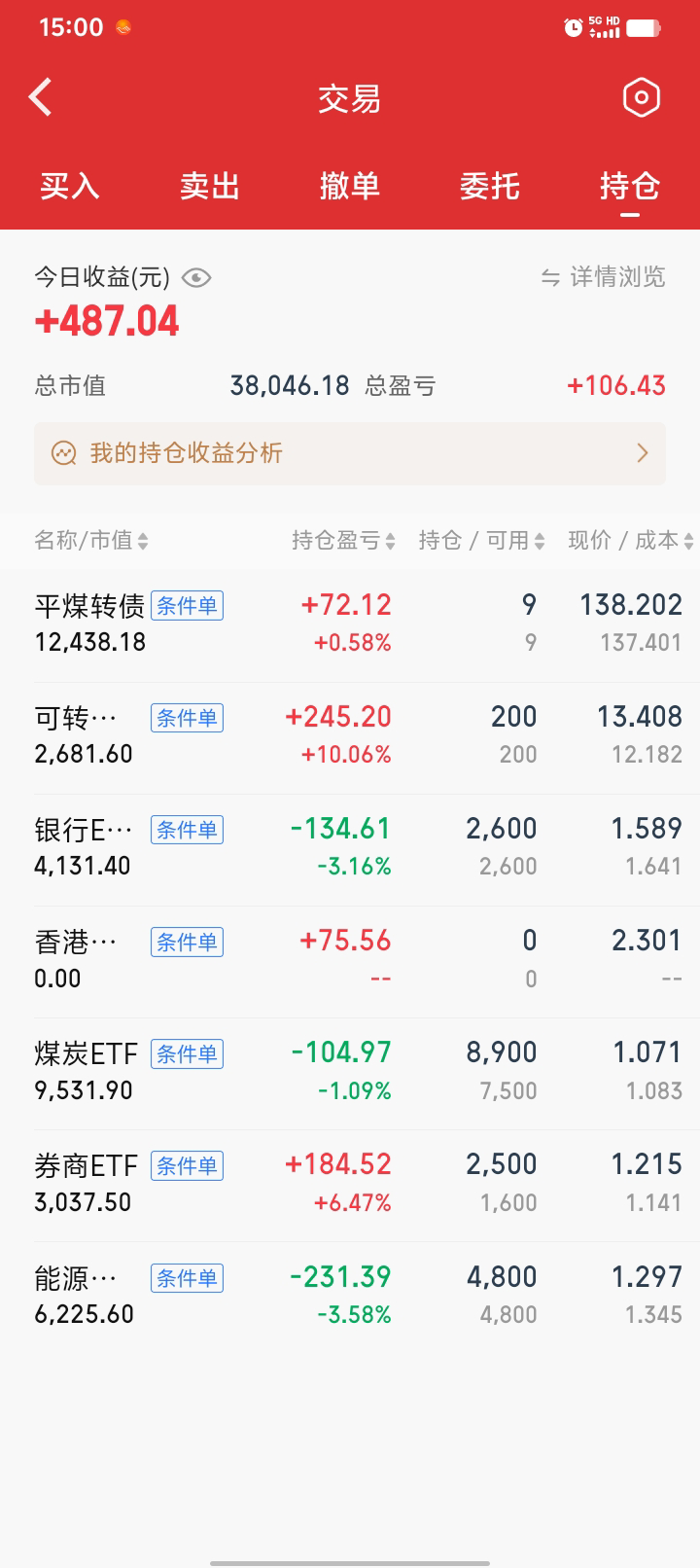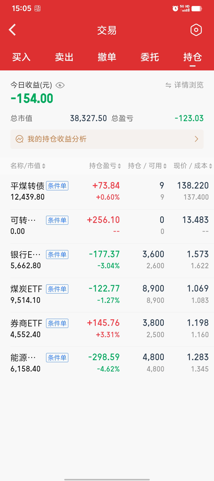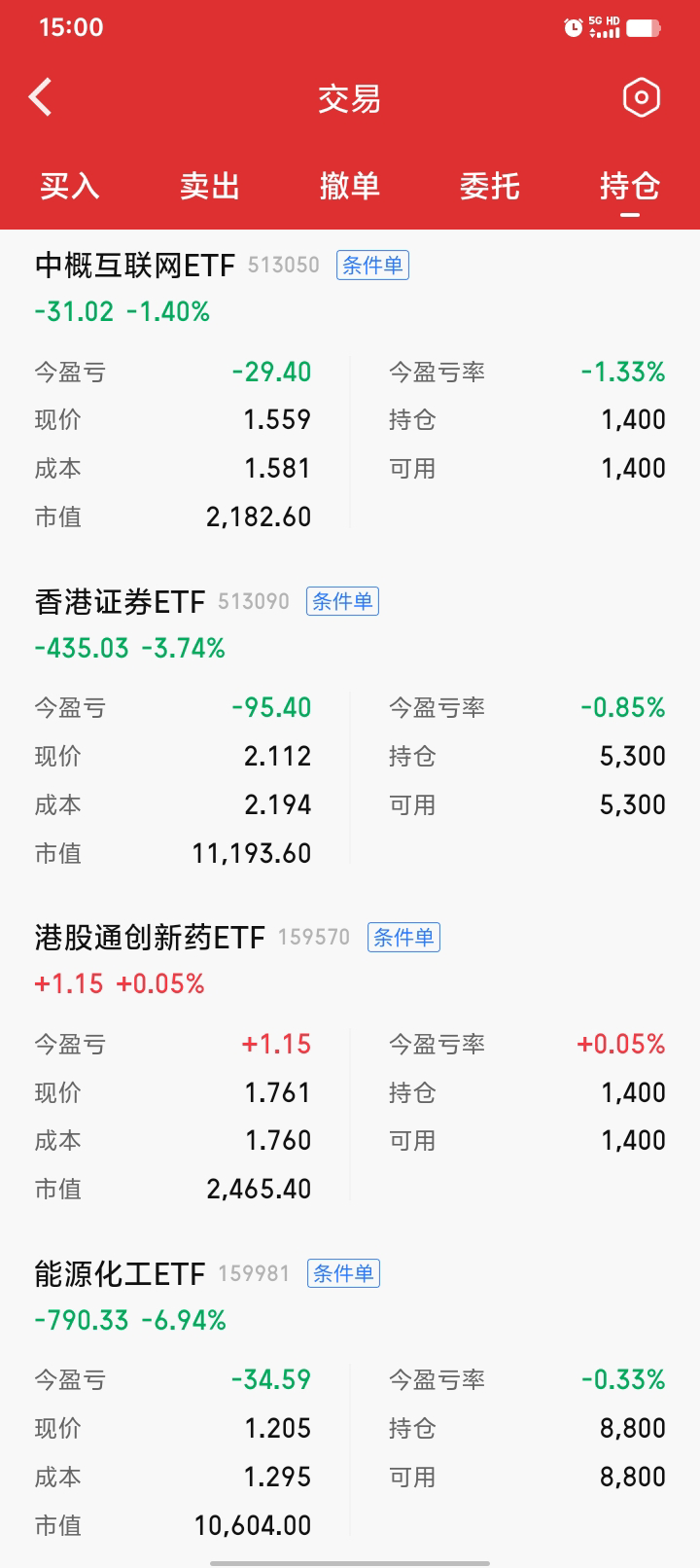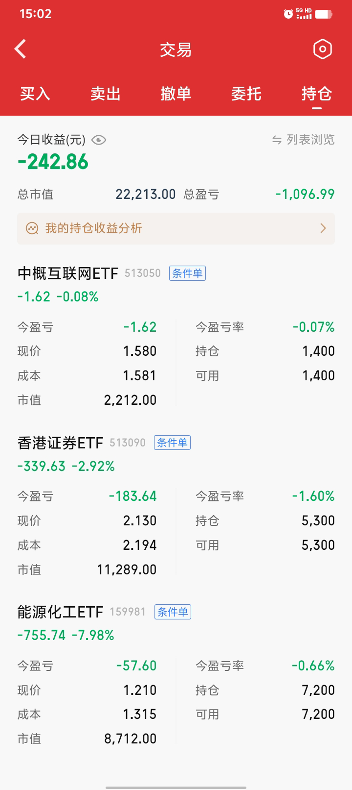 继续网格,清建材e,还剩两个品种了,后面改回网格交易条件单,不用手工了,华泰打电话说我的交易模式让他们亏本了,偷笑。网格间距大点好了。