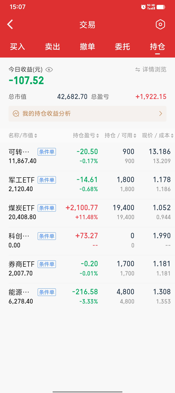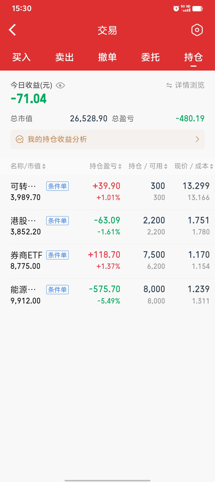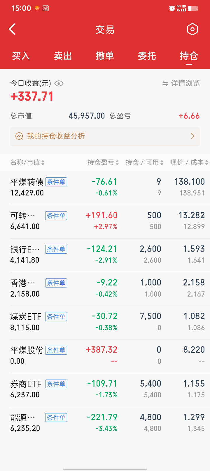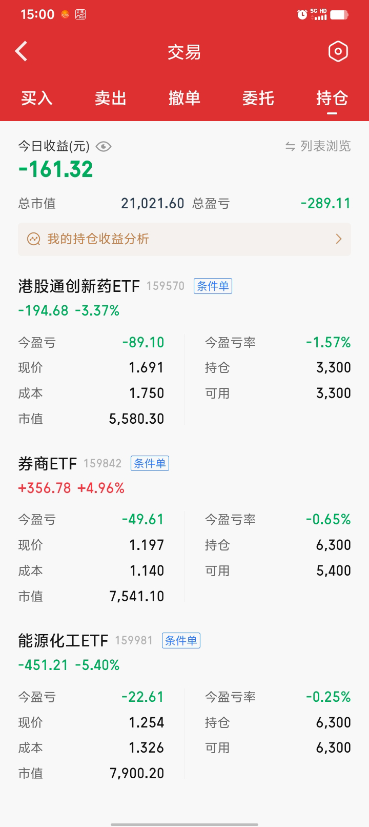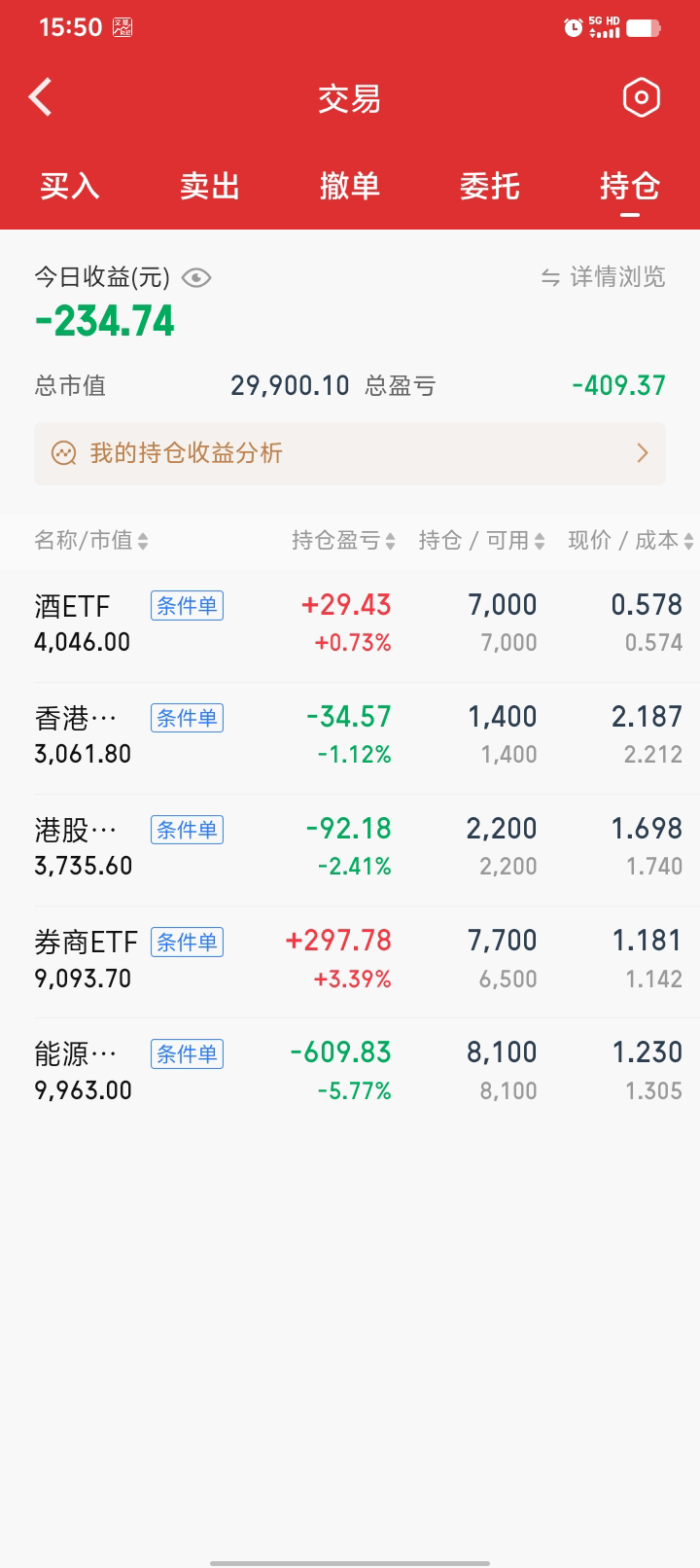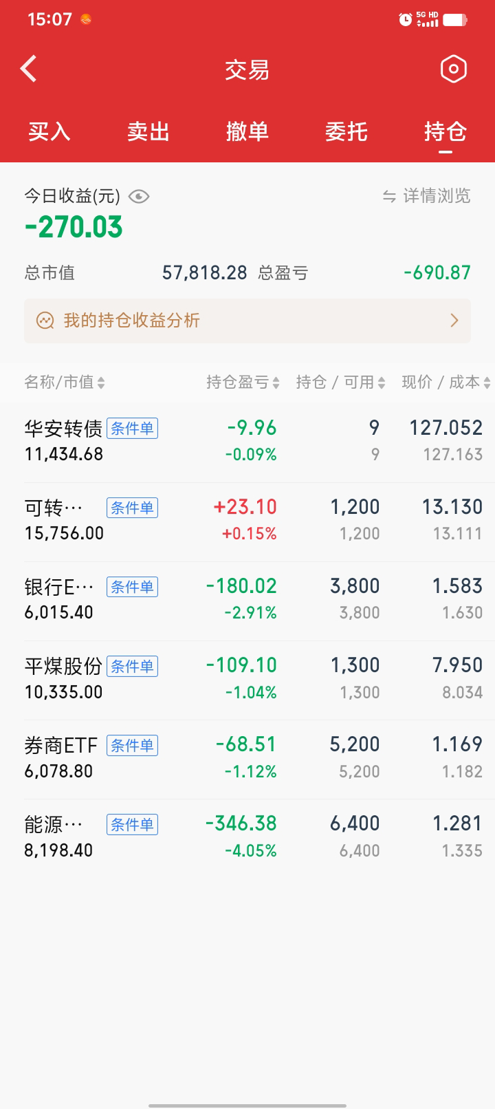 继续网格,清建材e,还剩两个品种了,后面改回网格交易条件单,不用手工了,华泰打电话说我的交易模式让他们亏本了,偷笑。网格间距大点好了。