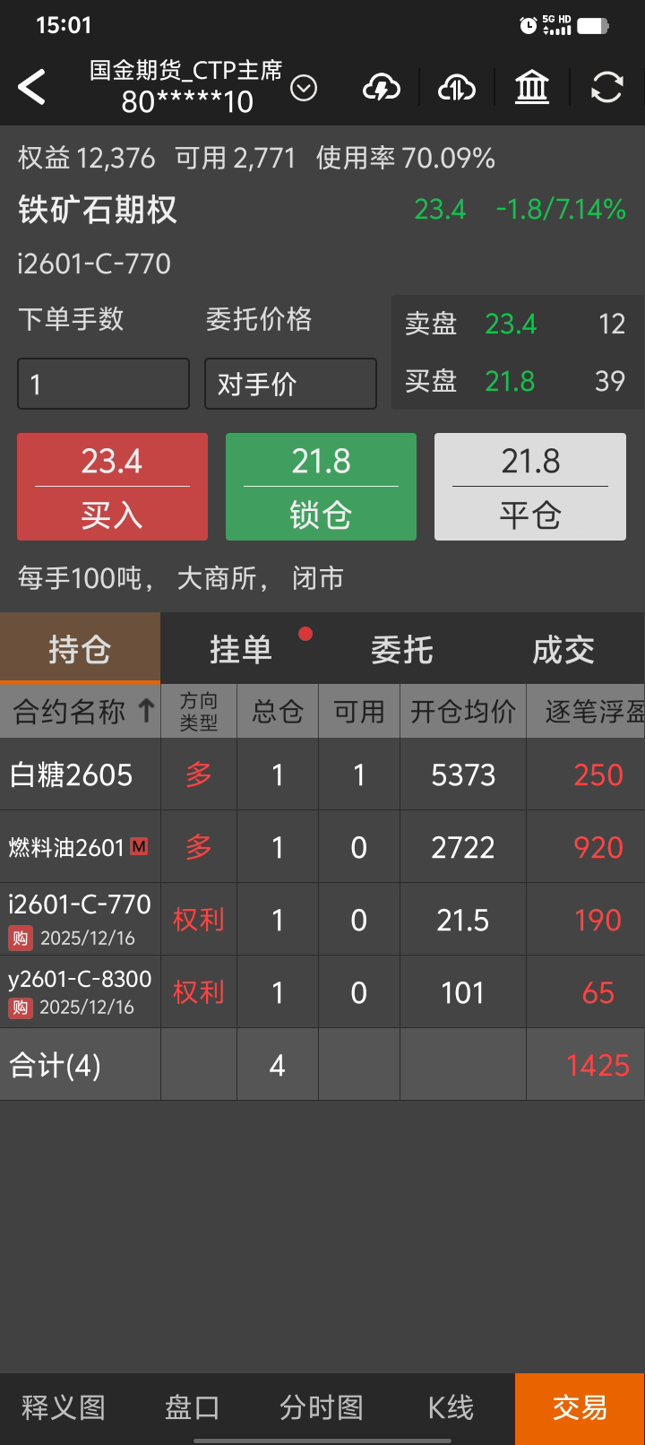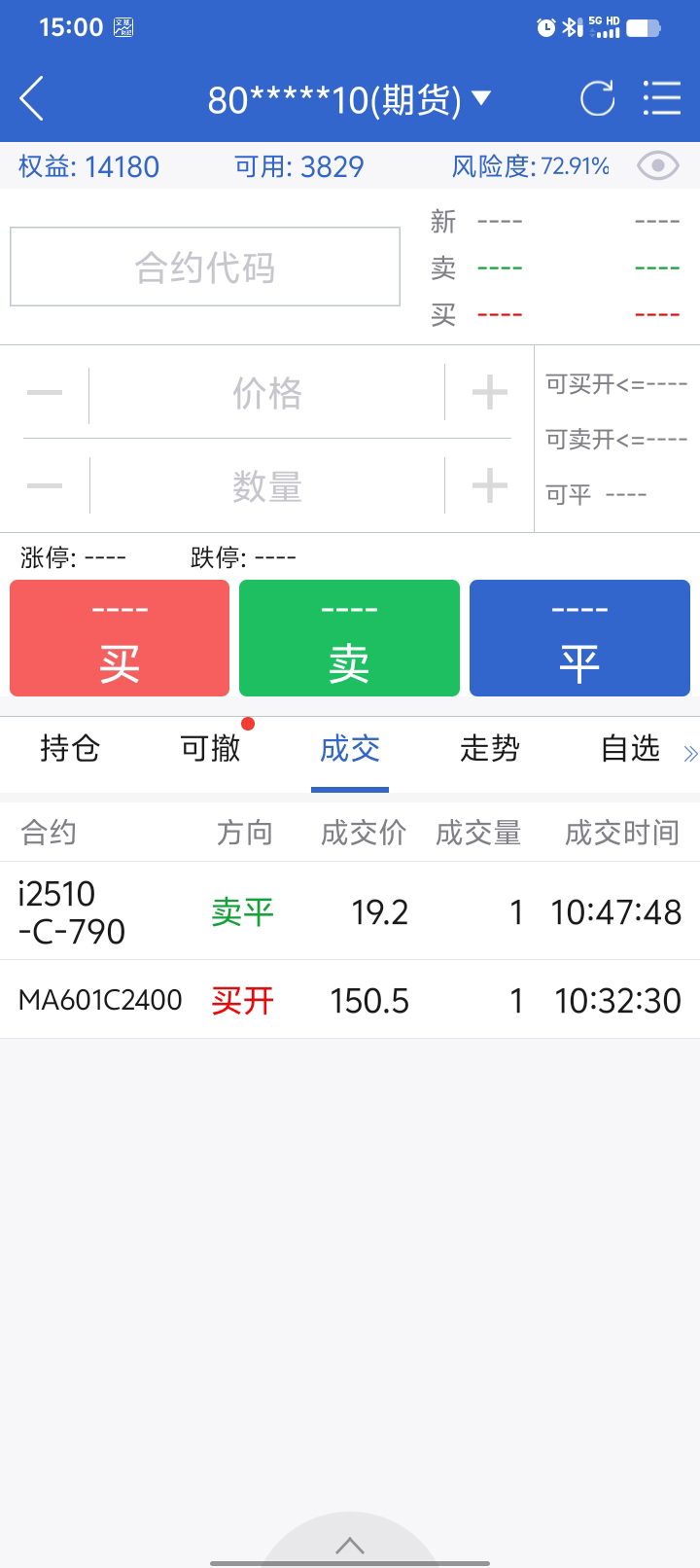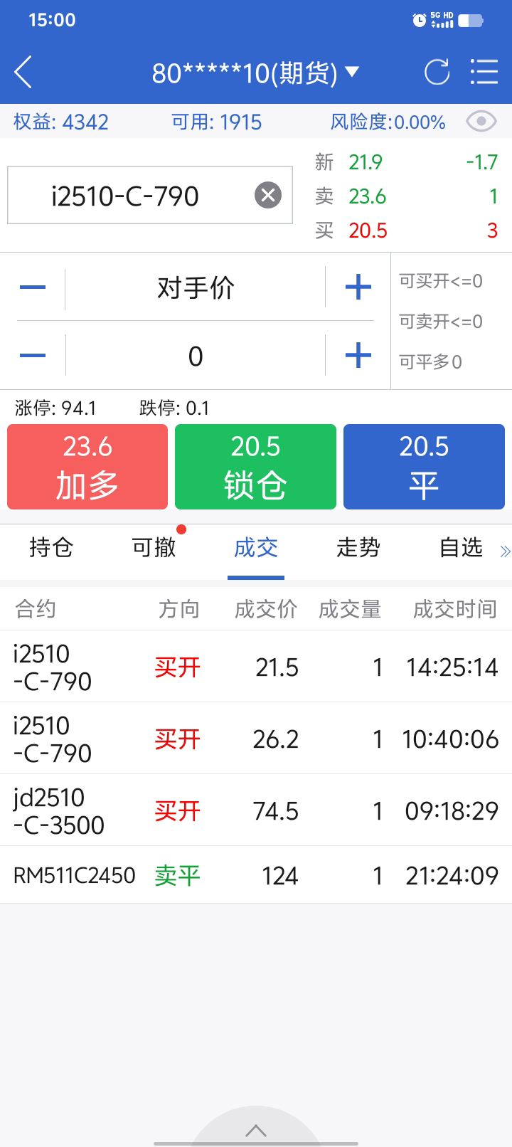 都没按计划,捂脸。想着把铁权清了做其他品种,结果铁大涨,算了,还是抄底吧,暂时不进了。铁权24.2出,亏90块。2361进ma01,3304进蛋01,2425进粕05,本来想买01的,买不了,查了下,要4手起。94进,105出粕权,正100块。