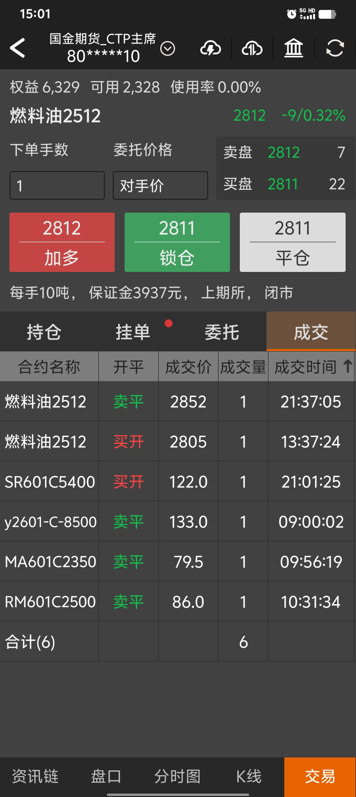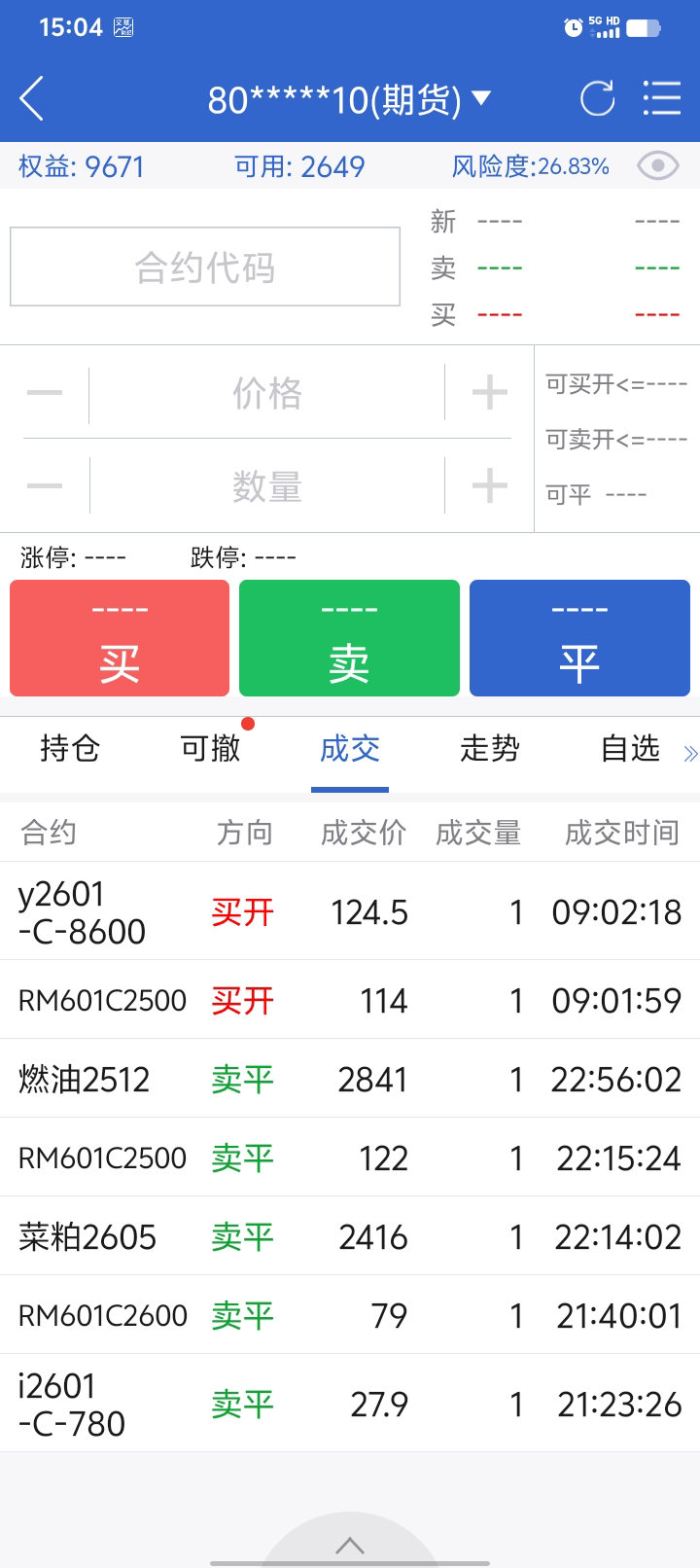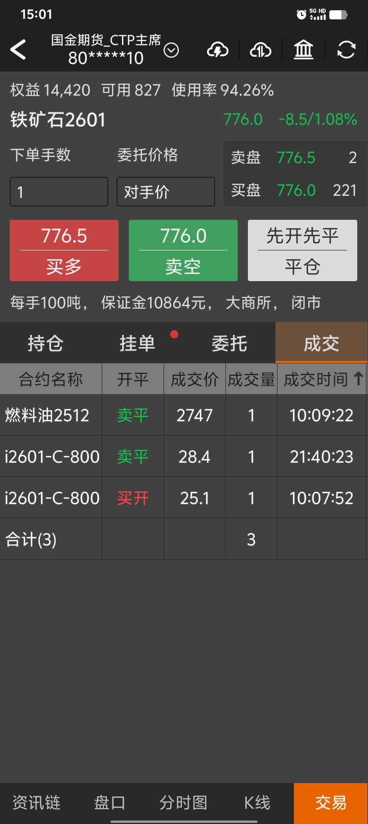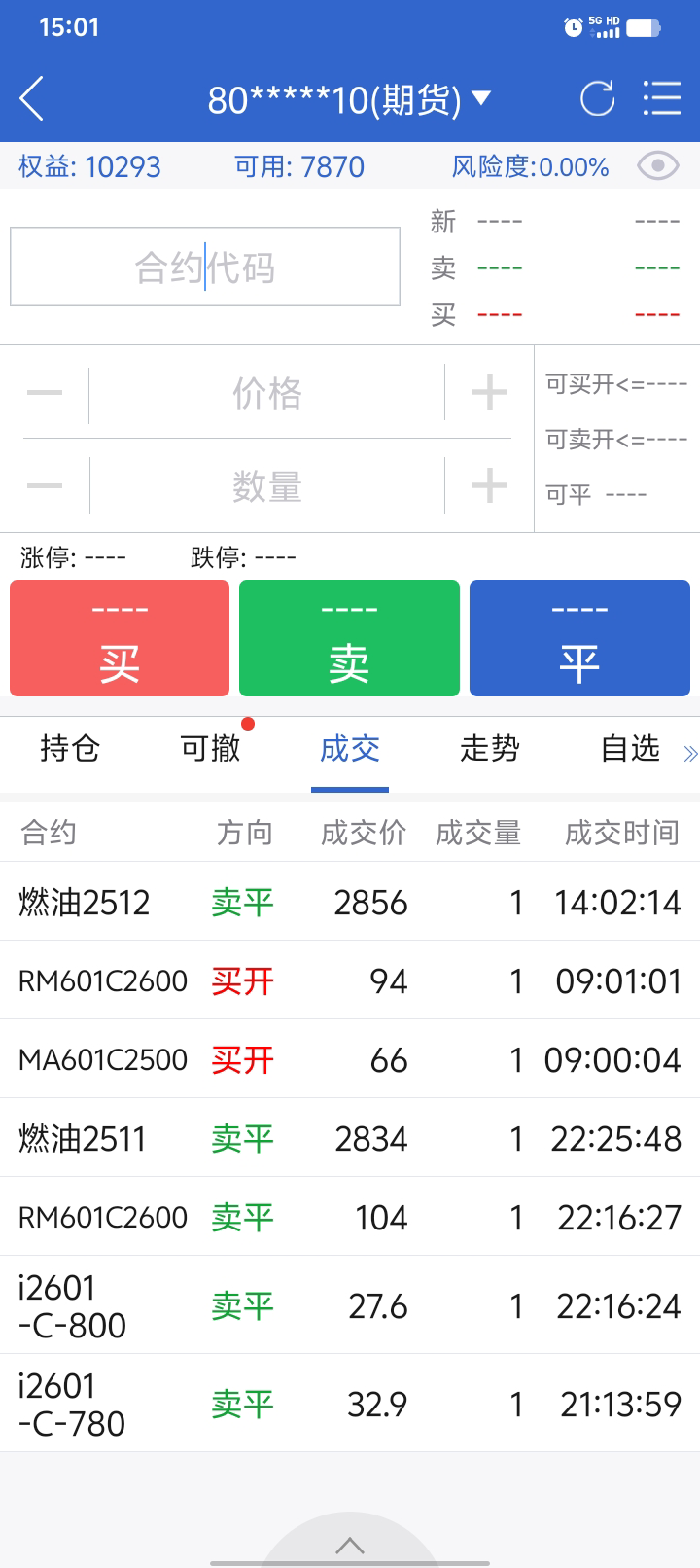 粕权和油权没按计划,114.5出粕权,平手。109.5进油权,120出,正100块。2772进fu12是乌龙,本来应该是挂2750,结果挂成2850。其他都是按计划,2797进fu12,33.6出铁权,正400块。后面暂时不进了,手续费还有30块,要是用其他的权和油,每次1块,还可以用30次,呵呵。