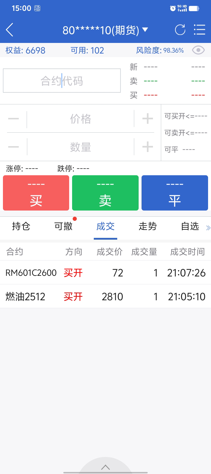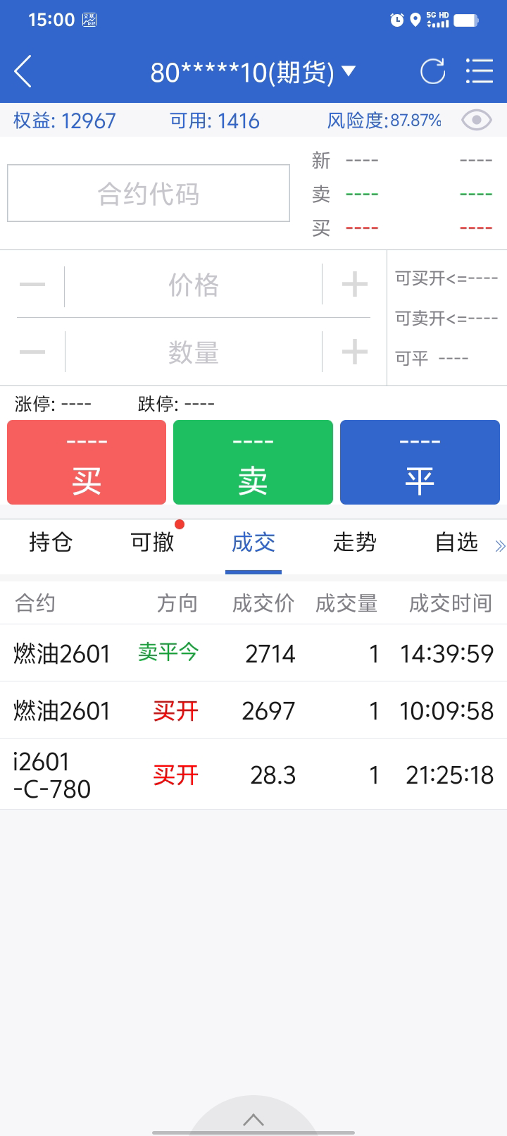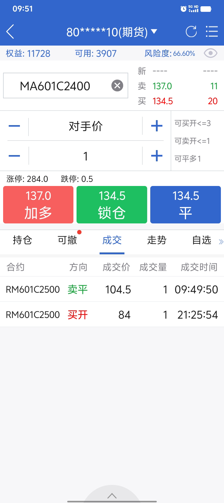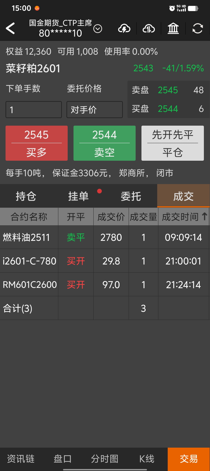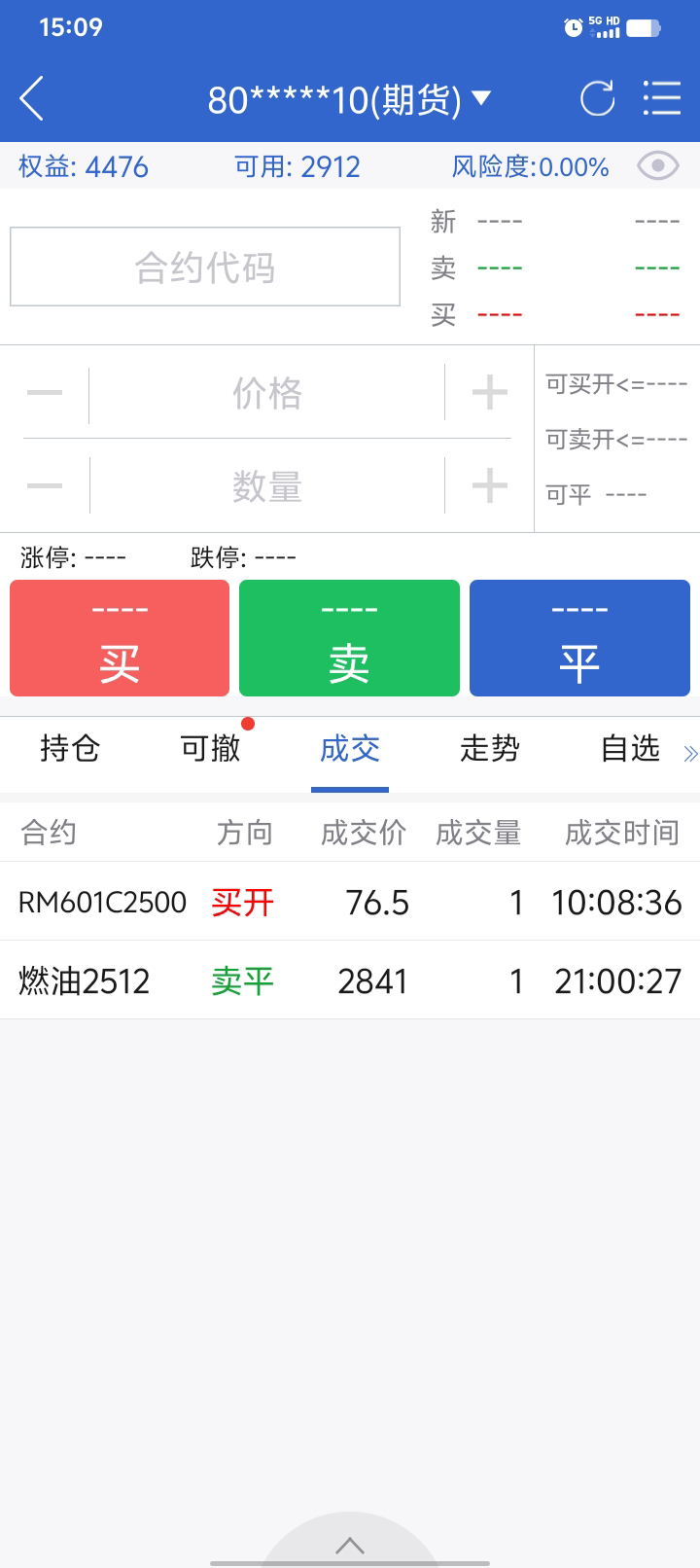 粕权和油权没按计划,114.5出粕权,平手。109.5进油权,120出,正100块。2772进fu12是乌龙,本来应该是挂2750,结果挂成2850。其他都是按计划,2797进fu12,33.6出铁权,正400块。后面暂时不进了,手续费还有30块,要是用其他的权和油,每次1块,还可以用30次,呵呵。