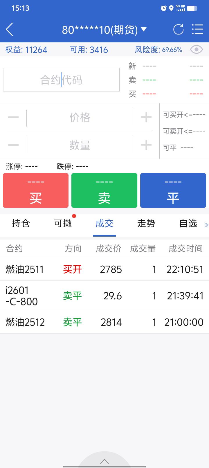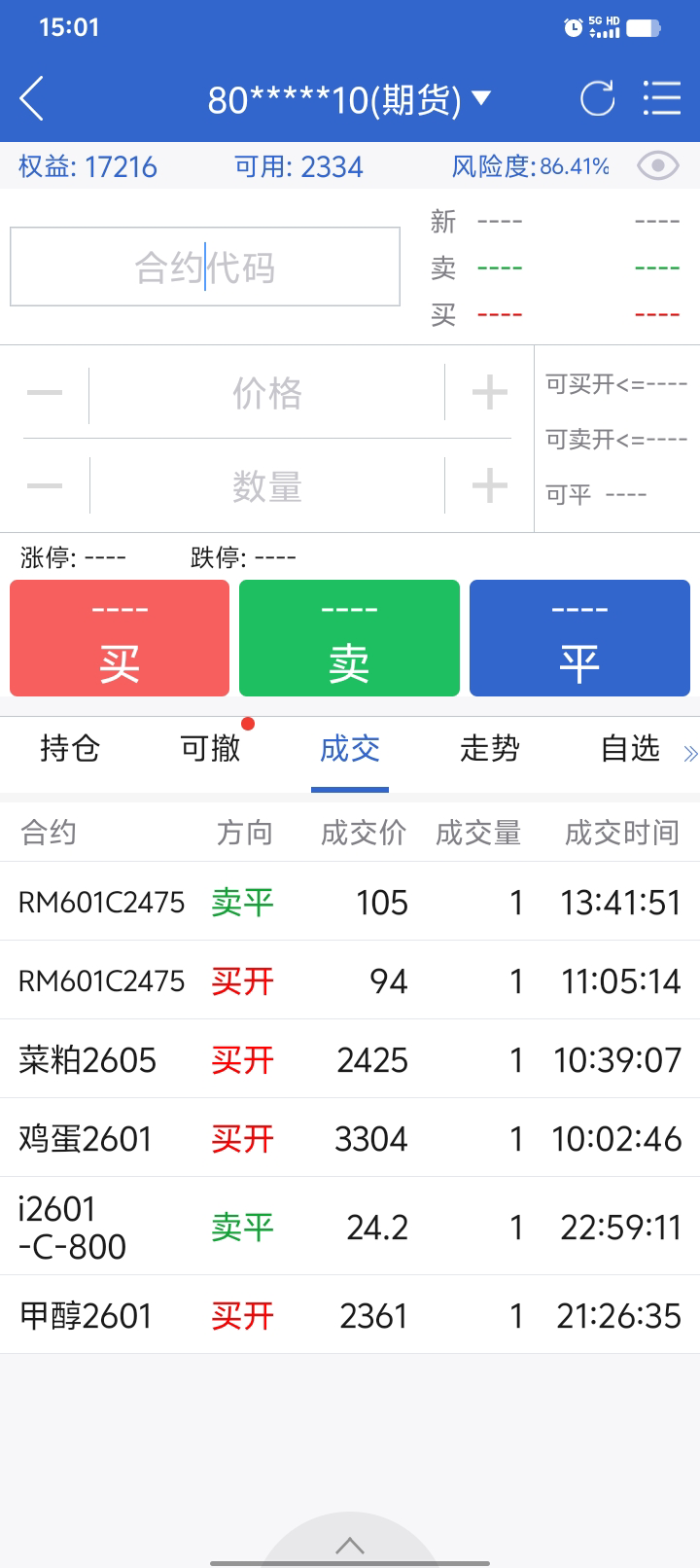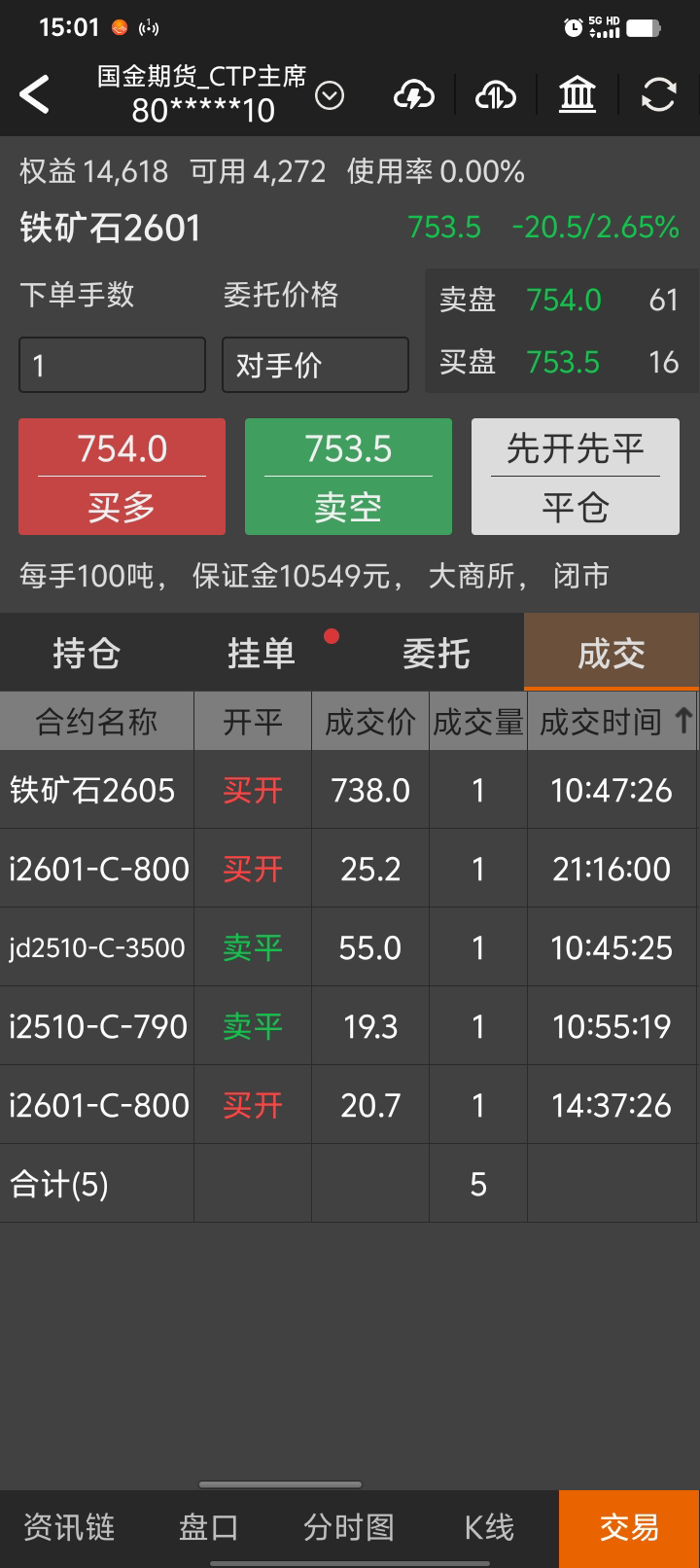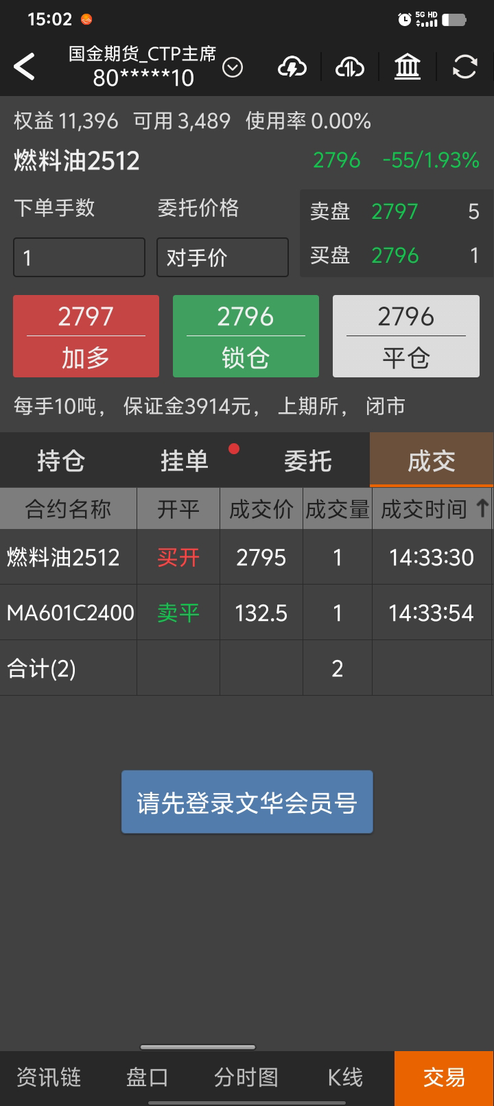 粕权和油权没按计划,114.5出粕权,平手。109.5进油权,120出,正100块。2772进fu12是乌龙,本来应该是挂2750,结果挂成2850。其他都是按计划,2797进fu12,33.6出铁权,正400块。后面暂时不进了,手续费还有30块,要是用其他的权和油,每次1块,还可以用30次,呵呵。