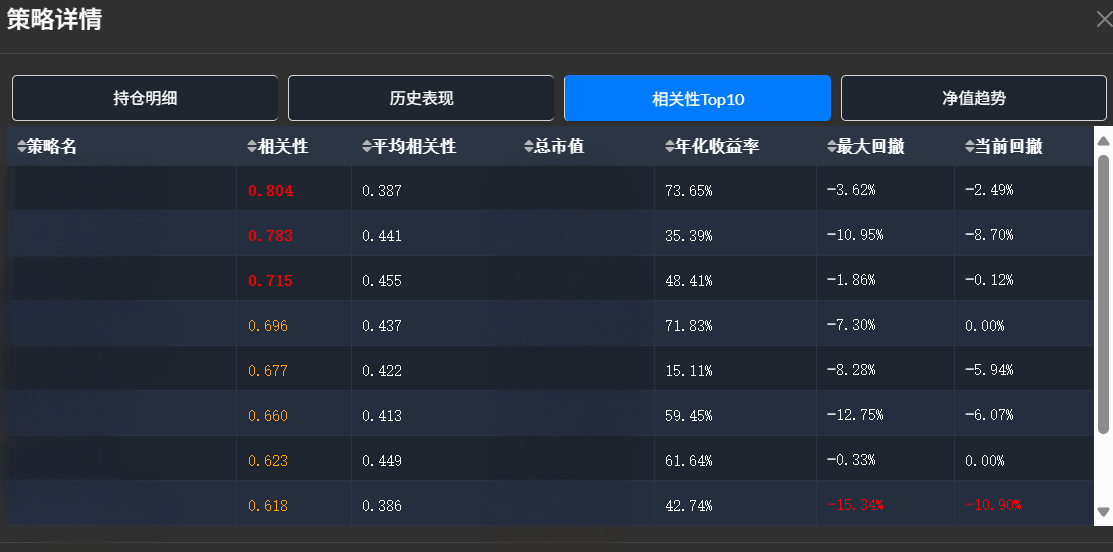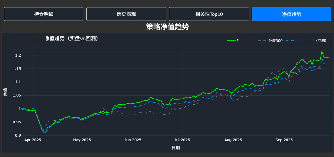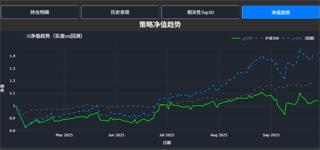又是一个折腾的月份,这个月做了几件事:1、计算所有实盘项目的平均相关性,以及每个项目的相关性TOP10;2、项目净值趋势图上同时显示实盘和回测净值曲线,这下子一目了然了,也对某些项目痛心疾首了;3、实现从qmt端自动定时推送数据到本地,净值市值这种数据量大的直接放到群晖里的mariaDB里,驾驶舱页面只要在下午4点过后刷新就能显示最新数据了。4、给相关性低、收益率高、回撤低、实盘曲线趋近回测曲线的项目增加资金,反之则减少资金乃至砍掉项目。