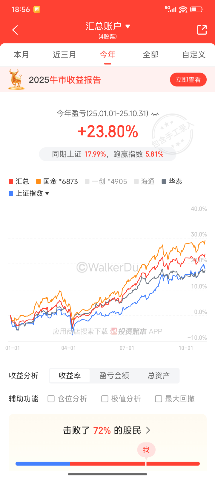 同花顺的投资账本是12月才用的,辛辛苦苦导了不少数据,收益率还是不准,明年应该就好了。