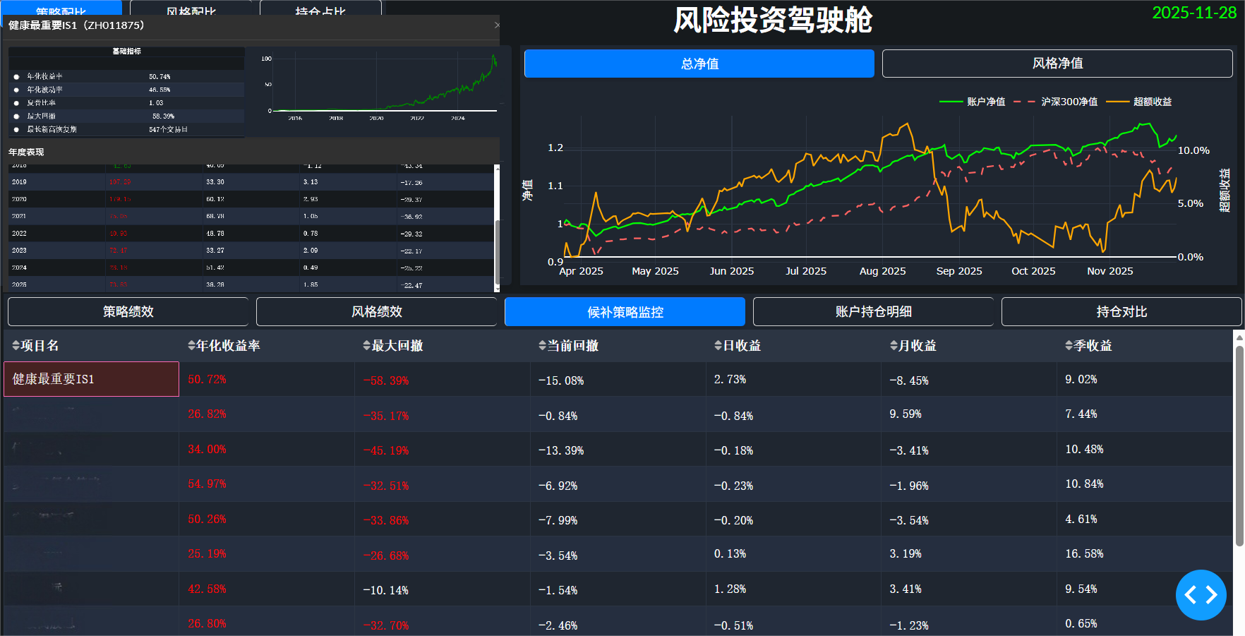 驾驶舱上加了个候补策略监控,主要是跟踪xq组合的(闯关东了吧确实挺厉害的),打算是在它们的月收益季收益或当前回撤很差时逢低配置。策略绩效里面也加了月收益季收益,也是打算视情况高抛低吸,尤其是在那些相关性高的上面加减仓,这会不会是反向优化就只能运行一段时间再看了。