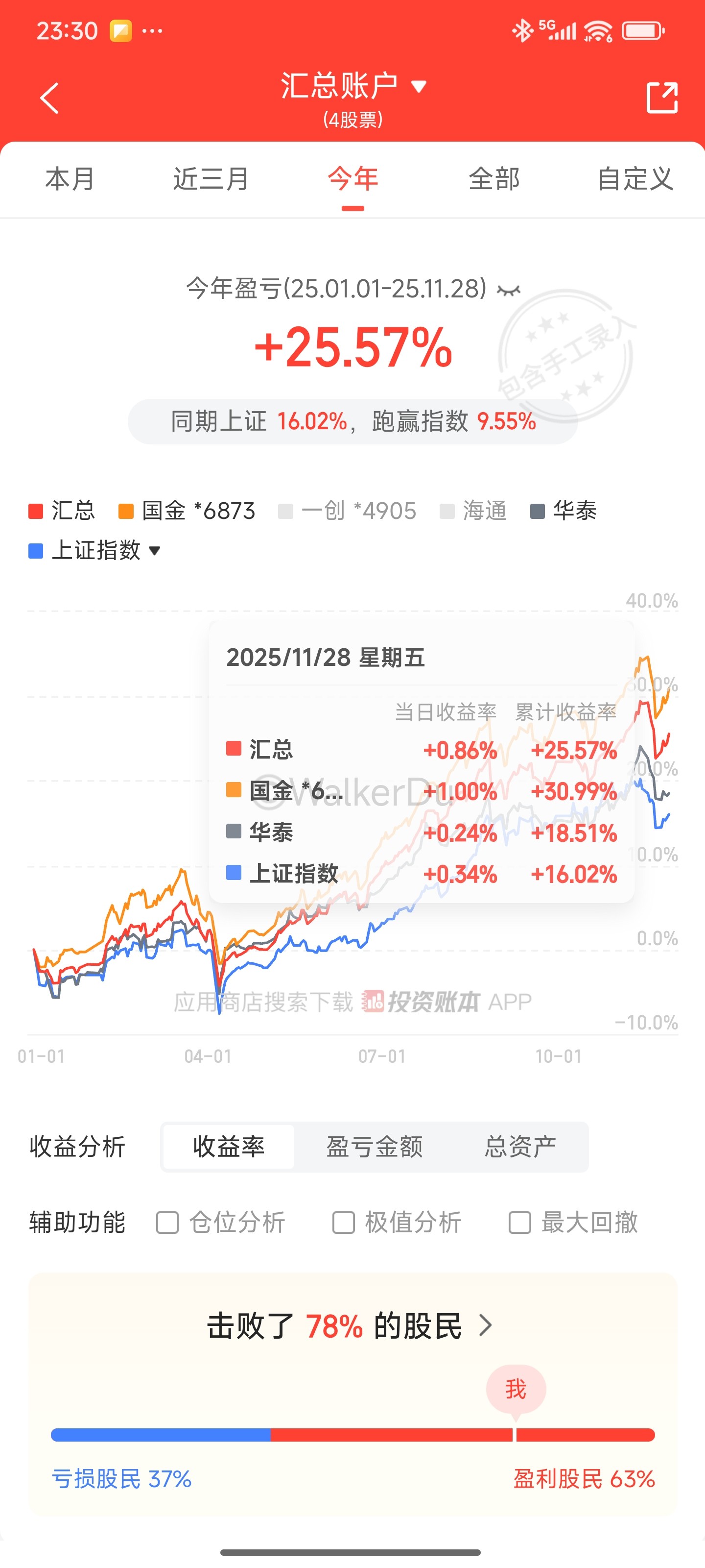 11月中旬时年度收益一度逼近30%,可惜又跌回去了,年度收益25.5%,仓位87.9%