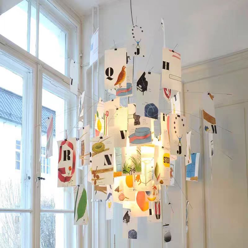 算是个艺术吊灯吧,上面插了一圈带夹子的金属条,用来挂自己打印的图片或者照片都行。给你看看别人的效果图,我家其实灯太长而且图片有点挡投影了。