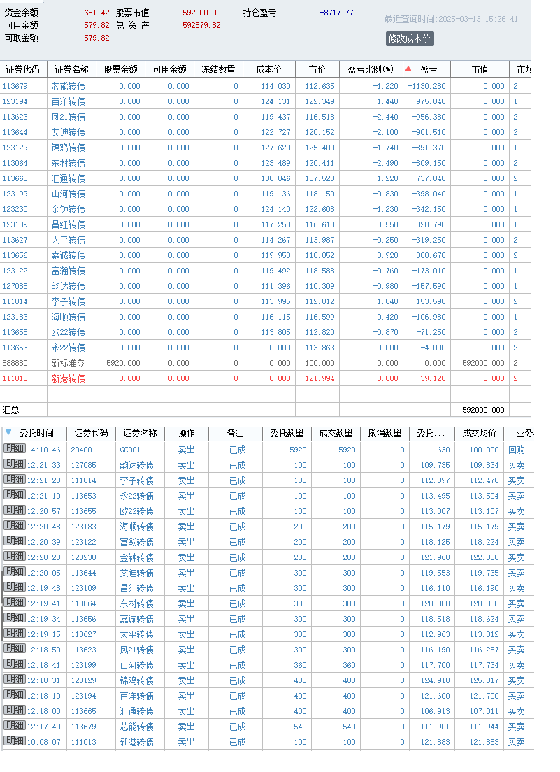 本韭菜以为自己足够小心了,没想到,冲抵还是出现了问题,导致今天旧的那个模拟盘出现了超卖,原因很简单,理论上9:18的卖出委托,实际9:19才发出,导致时间点错位,进而依靠时点冲抵失败【已经没有持仓的,但记录认为依然持仓】,这是同花顺这种无备注的专属问题【没有备注,依靠委托时间来确定时点】,解决方式也简单,就是对冲抵为为负的,保留出来,正常构成新记录后,依次删除冲抵异常的,每次只删除第一个,虽然时点可能错位,但这已经差不多是最佳方式了