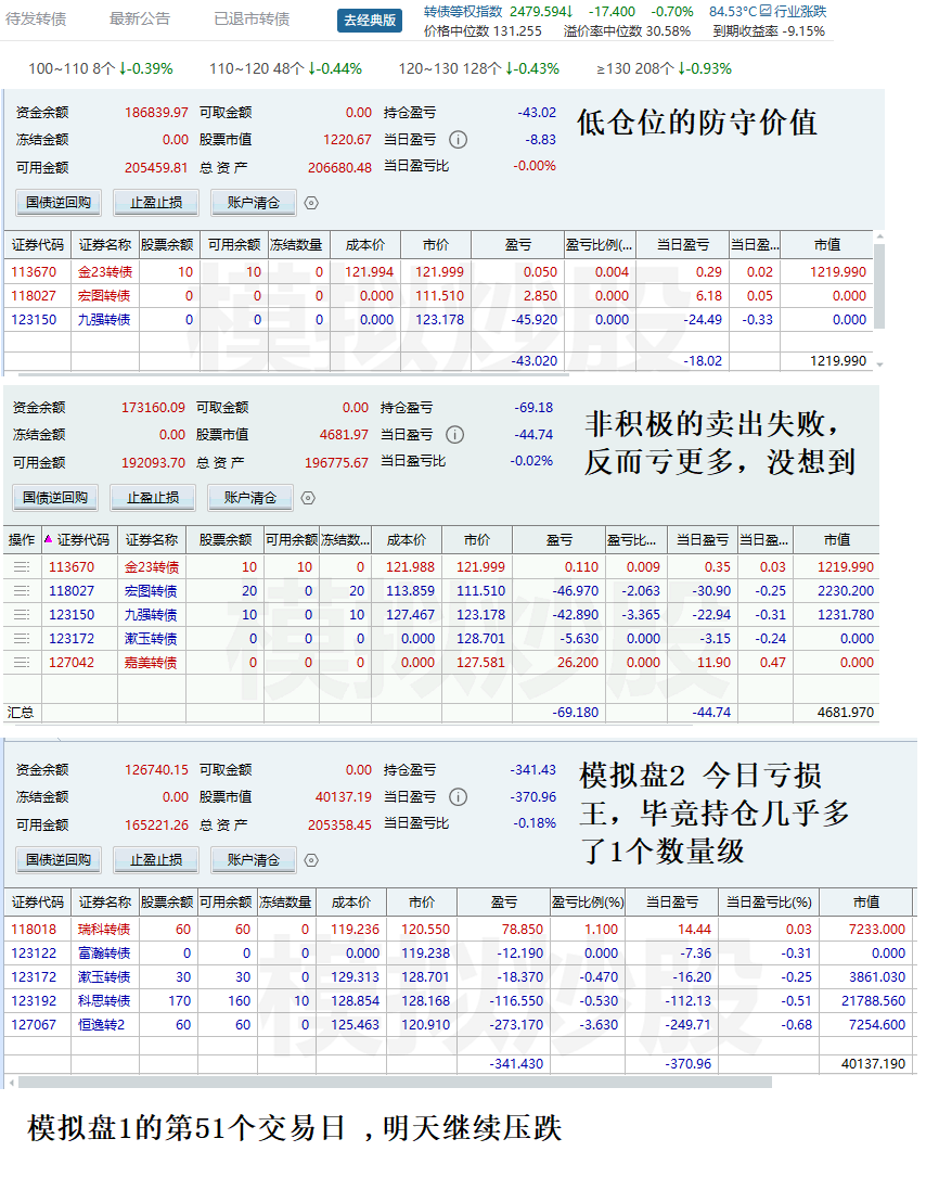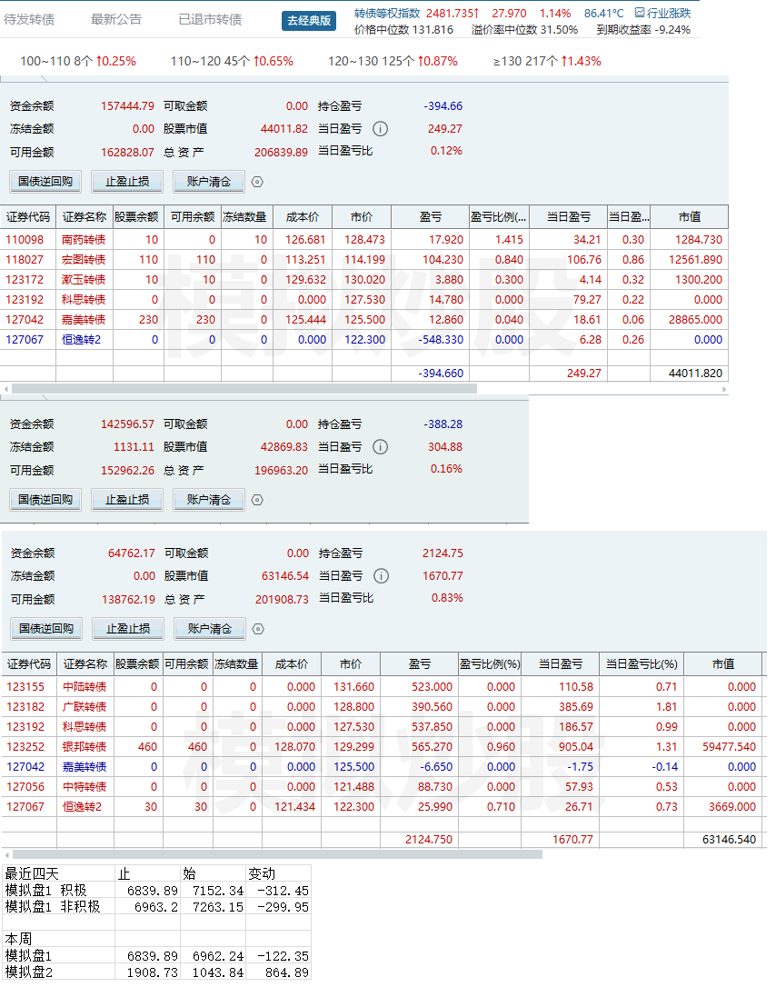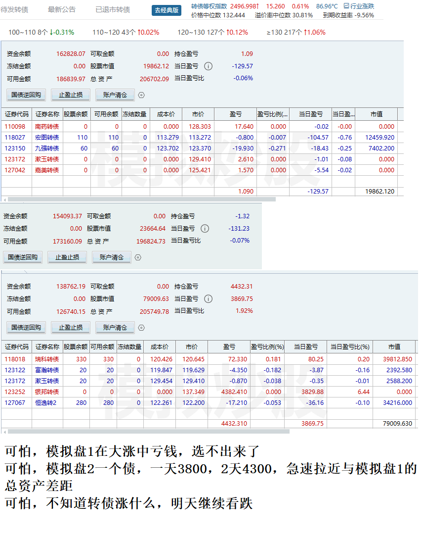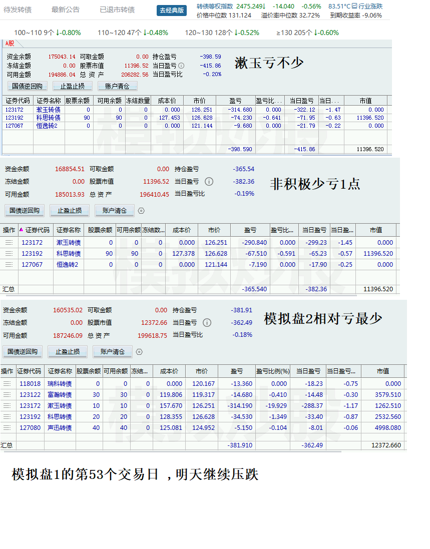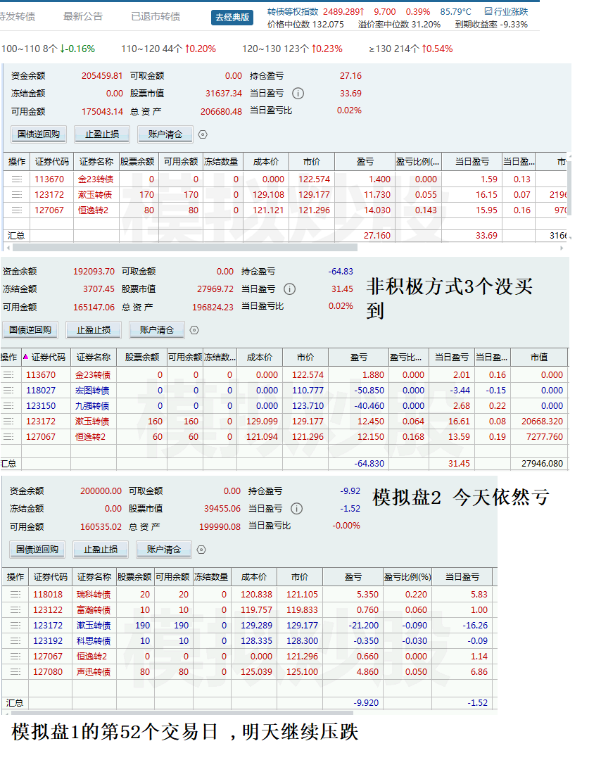 虽然前面几个交易日,并没有表现出这种优势,但我相信,只要次数够多,最终会让概率发挥作用,截至中午收盘,百元溢价来到了30.85,继续等双杀,至于模拟盘收益,模拟盘1亏265、模拟盘2亏187,模拟盘3亏95,倒是符合模拟盘3回撤更小的预期