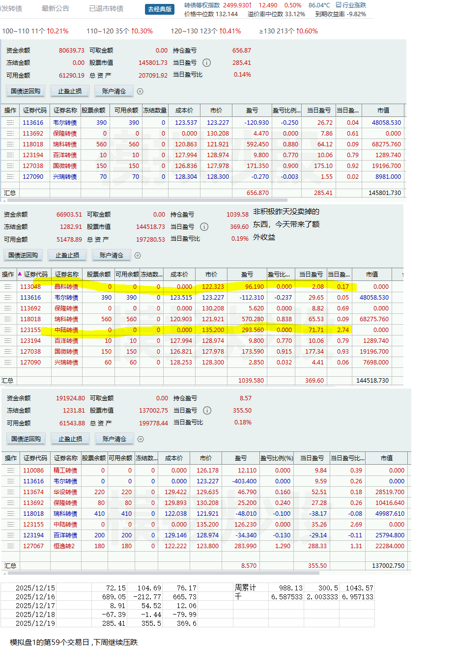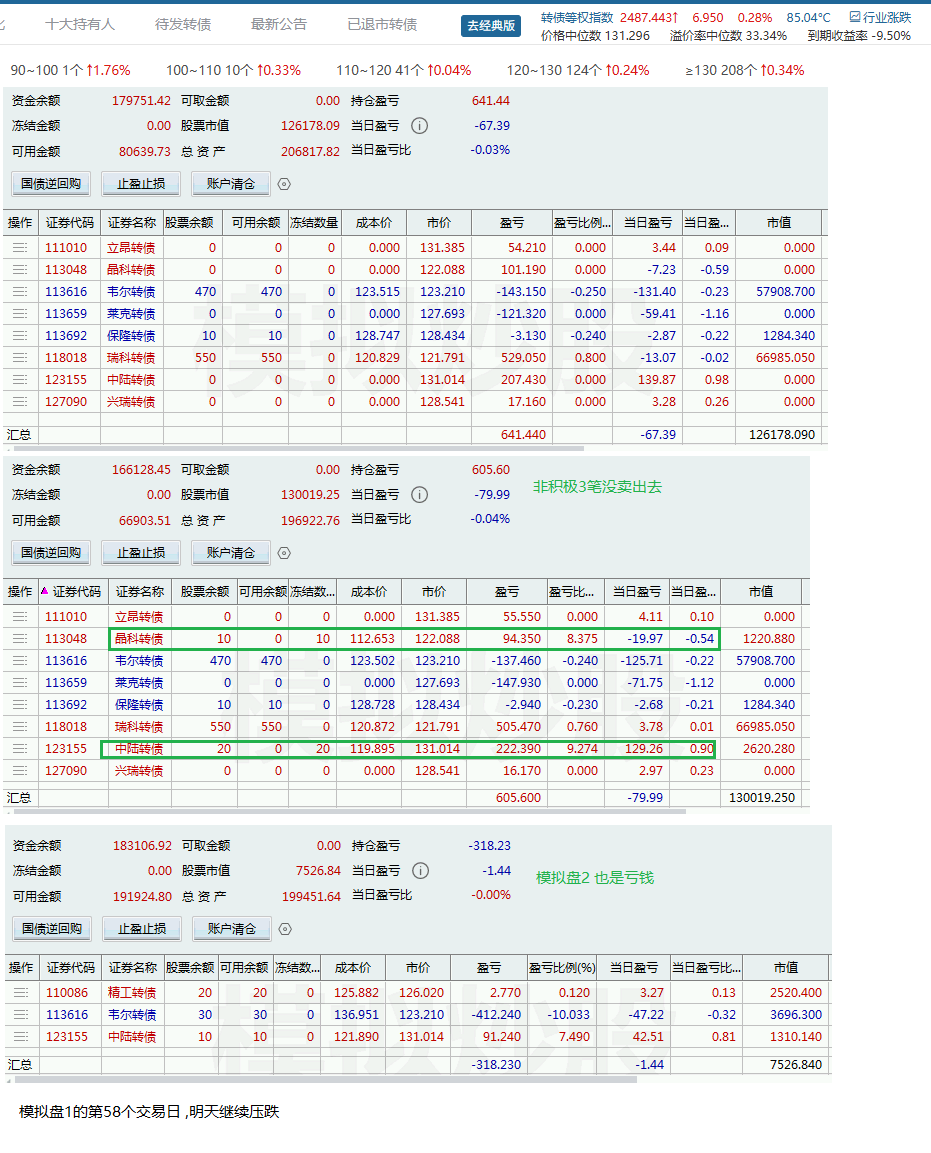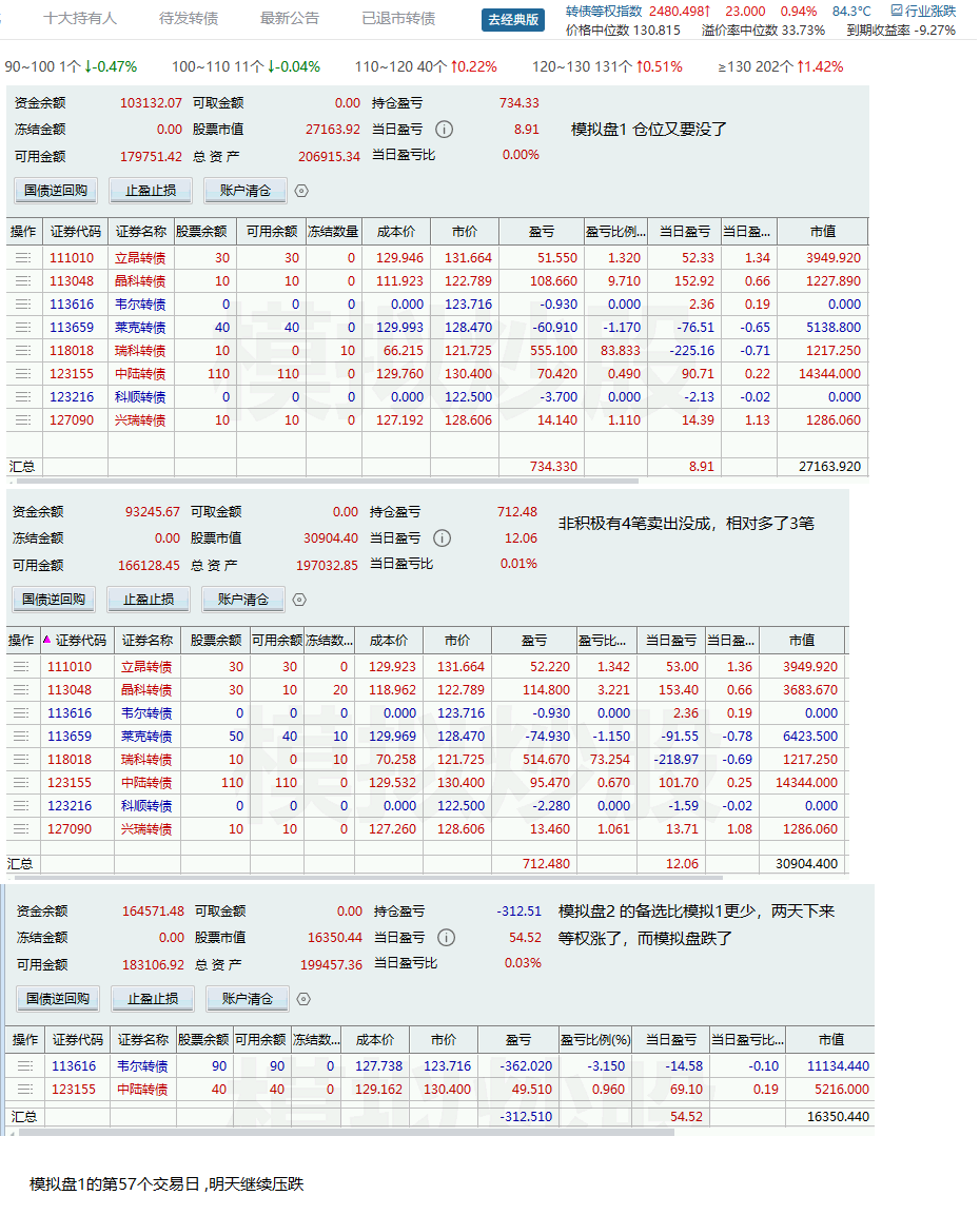 虽然前面几个交易日,并没有表现出这种优势,但我相信,只要次数够多,最终会让概率发挥作用,截至中午收盘,百元溢价来到了30.85,继续等双杀,至于模拟盘收益,模拟盘1亏265、模拟盘2亏187,模拟盘3亏95,倒是符合模拟盘3回撤更小的预期