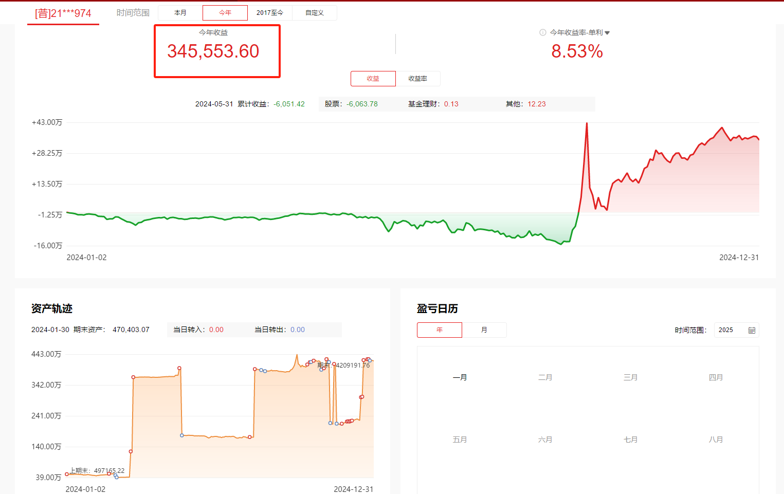 记录一下2024年的投资情况:2024年一直半仓以下运行,大部分时候权益仓位低于200W,收益34.5W。