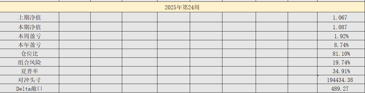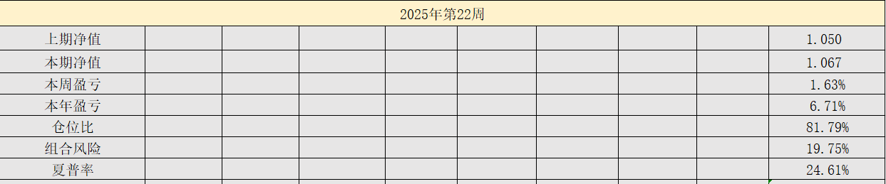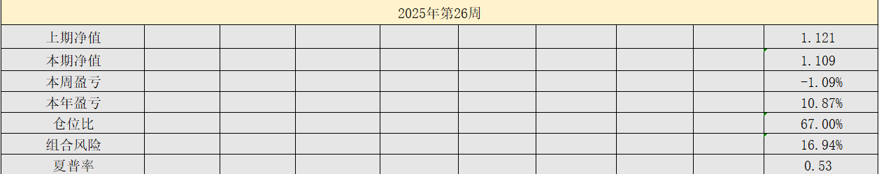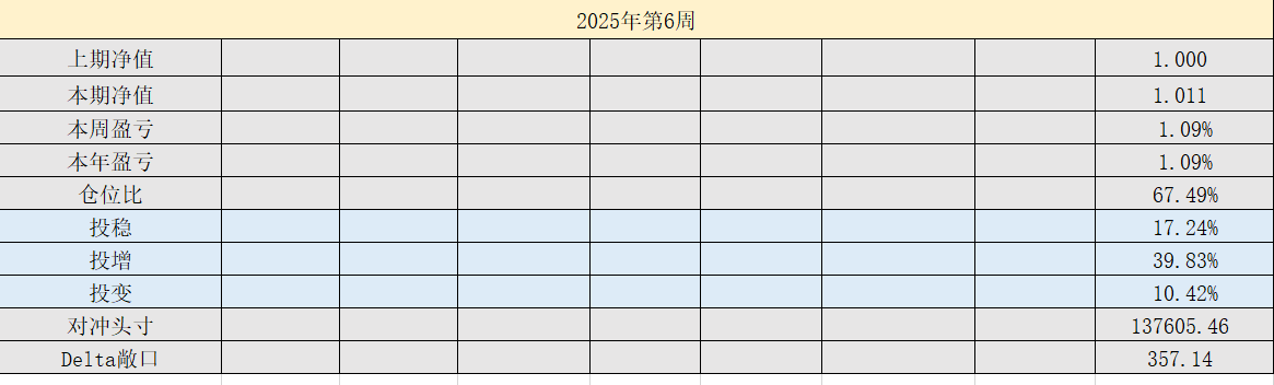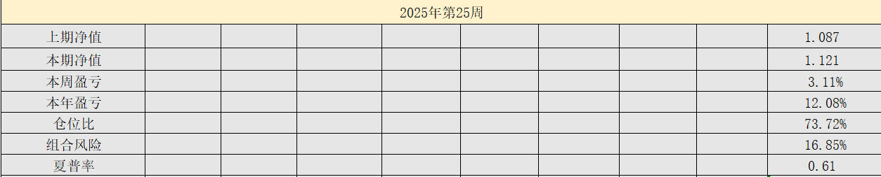 2025年06周,净值:1.011,本周盈亏:0.89%,本年盈亏:1.09%,总仓位:67%