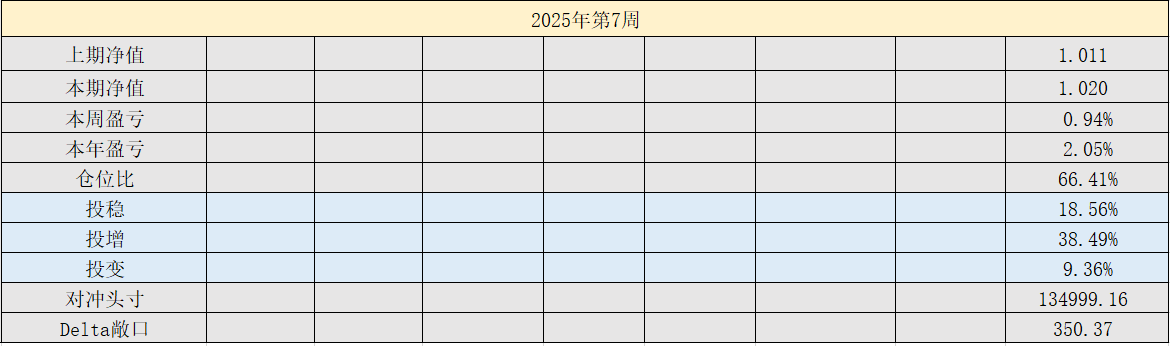 2025年07周,净值:1.020,本周盈亏:0.94%,本年盈亏:2.05%,总仓位:66%