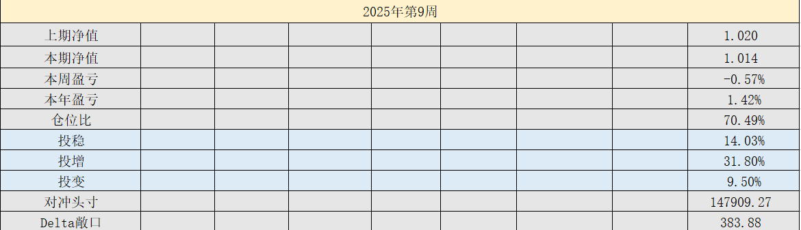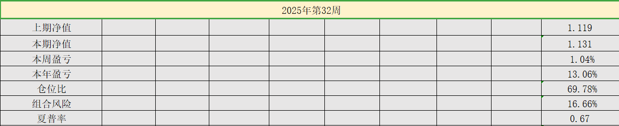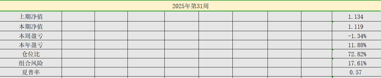 2025年08周,净值:1.014,本周盈亏:-0.57%,本年盈亏:1.42%,总仓位:70%