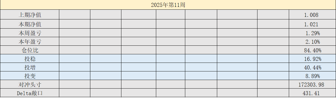2025年11周,净值:1.021,本周盈亏:1.29%,本年盈亏:2.1%,总仓位:84%