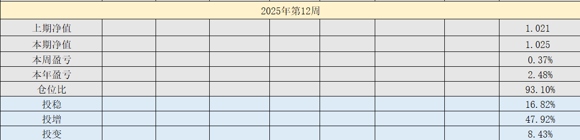 2025年12周,净值:1.025,本周盈亏:0.37%,本年盈亏:2.48%,总仓位:93%