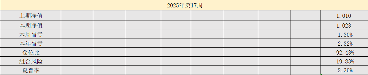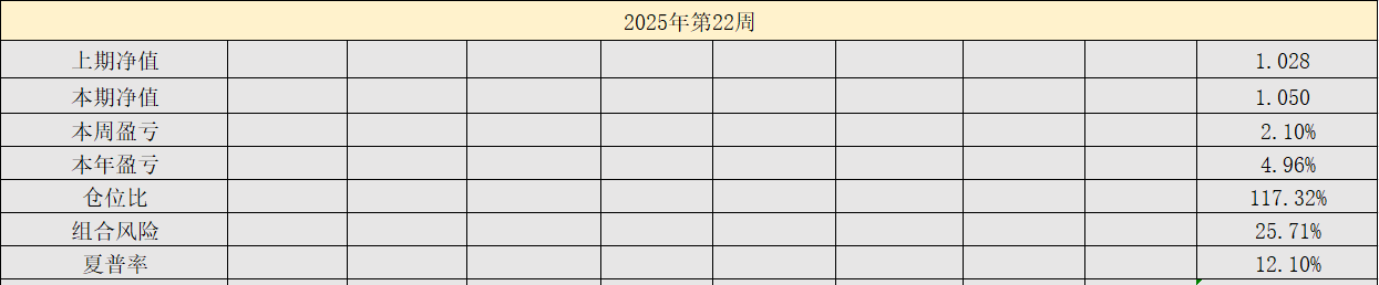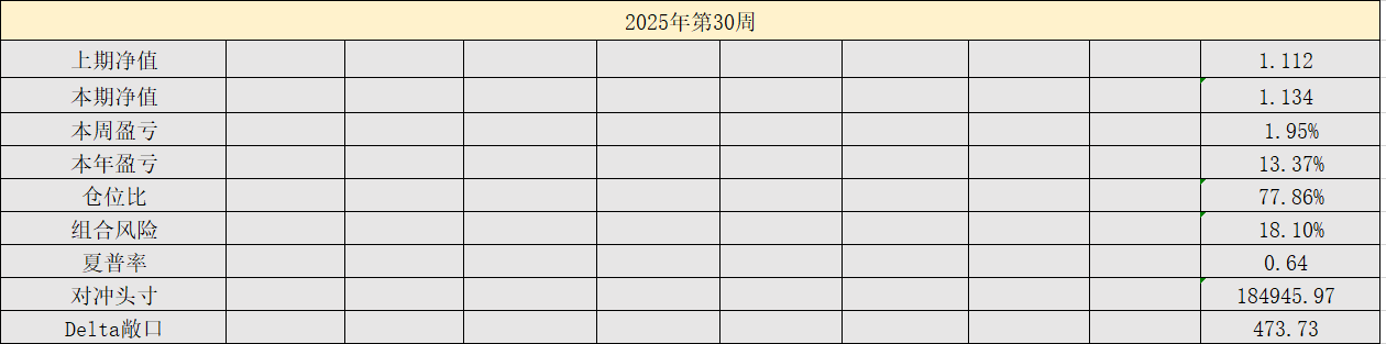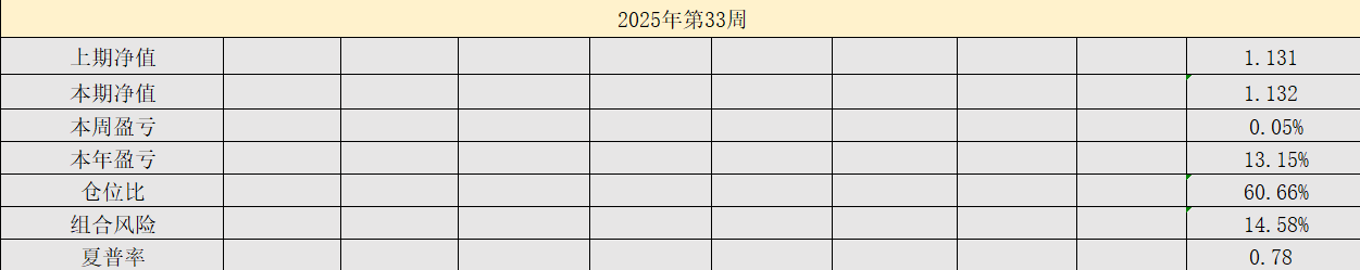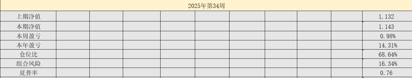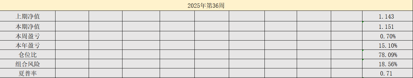 2025年36周,净值:1.151,本周盈亏:0.7%,本年盈亏:15.1%,总仓位:78%