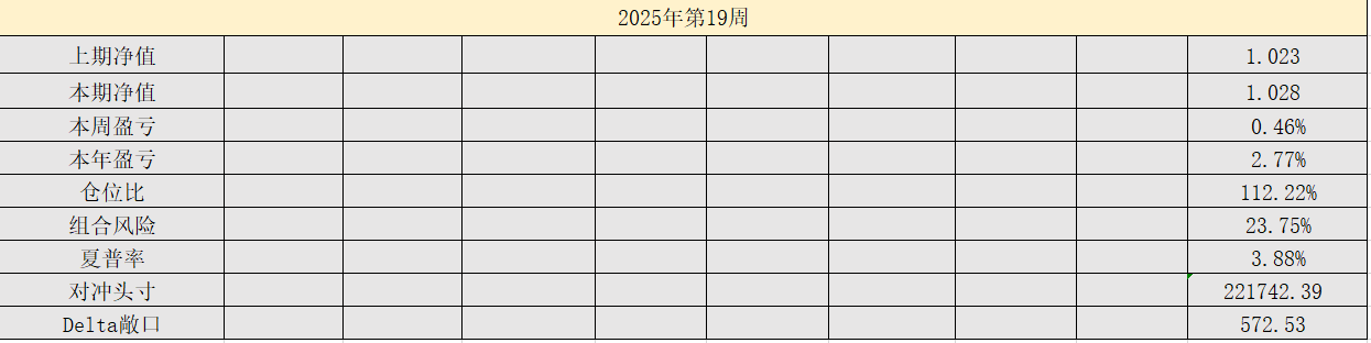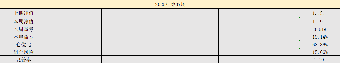 2025年37周,净值:1.190,本周盈亏:3.5%,本年盈亏:19%,总仓位:64%
