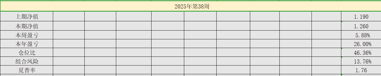 2025年38周,净值:1.260,本周盈亏:5.88%,本年盈亏:26%,总仓位:46%
