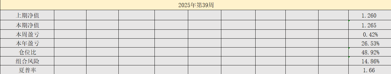 2025年39周,净值:1.265,本周盈亏:0.42%,本年盈亏:26.5%,总仓位:49%