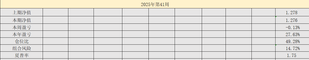 2025年41周,净值:1.276,本周盈亏:-0.13%,本年盈亏:27.6%,总仓位:49%