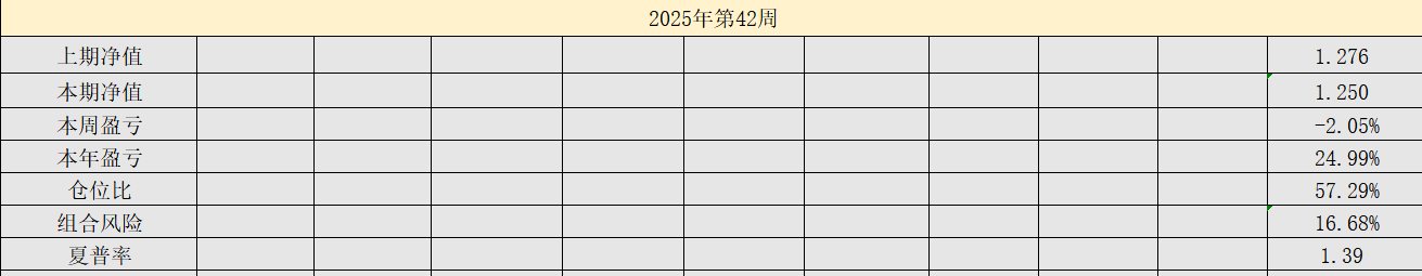 2025年42周,净值:1.250,本周盈亏:-2.05%,本年盈亏:24.9%,总仓位:57%