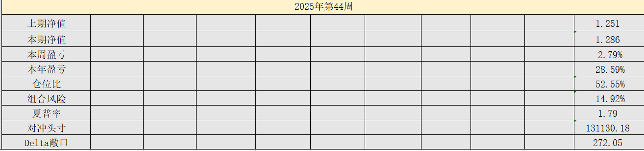2025年45周,净值:1.286,本周盈亏:2.79%,本年盈亏:28.6%,总仓位:52%