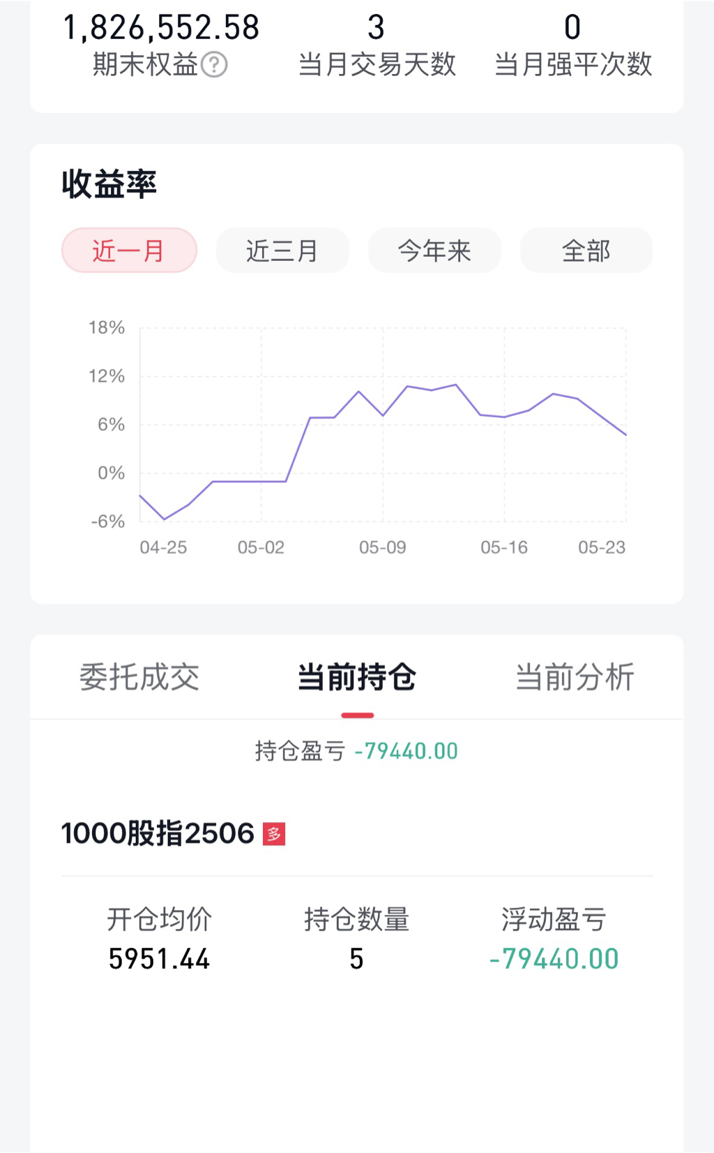 楼主这个策略的核心理念是什么?可否展开说说。谢谢!策略不方便公开,但可以谈谈模型的结构框架,有2个模块,做多模块和做空模块,以多头为主,空头为辅。穿插价差套利,中证1000和500的相互转换。针对大盘高位和低位,会有不同的算法来提高或降低交易频率。最后,还是老生常谈一点,所有衍生品的最大风险就是资金链管理,管控风险,长期思维加系统性交易,才能在市场中立足。