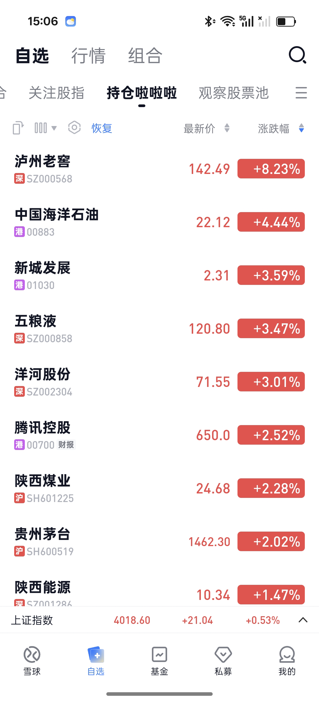 今天的上涨,主要靠白酒和腾讯以及沪深300。30%多仓位的白酒整体还尚未解套。老窖一马当先,安心持有。腾讯只有8%左右仓位了。短期不会再减了。银行好像还没开始表现。
