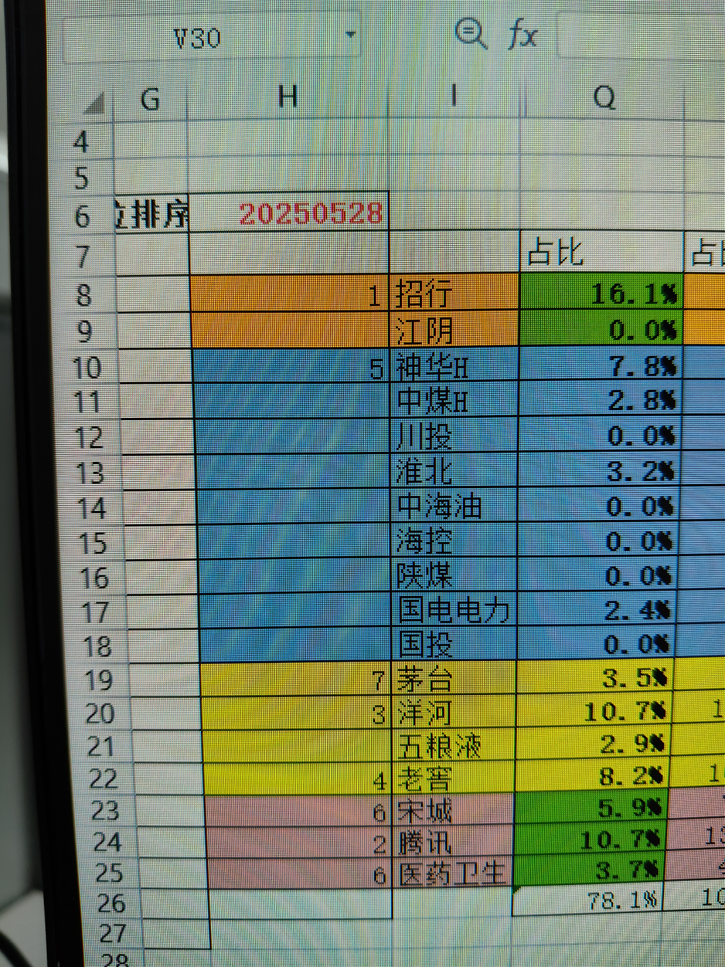 神华h和中煤h的分红在途,未计算在内。到账后再复投吧。煤炭和白酒,都在下行周期,煤炭已经有60%企业亏损了,前五个月行业净利润同比腰斩。白酒继续观察。