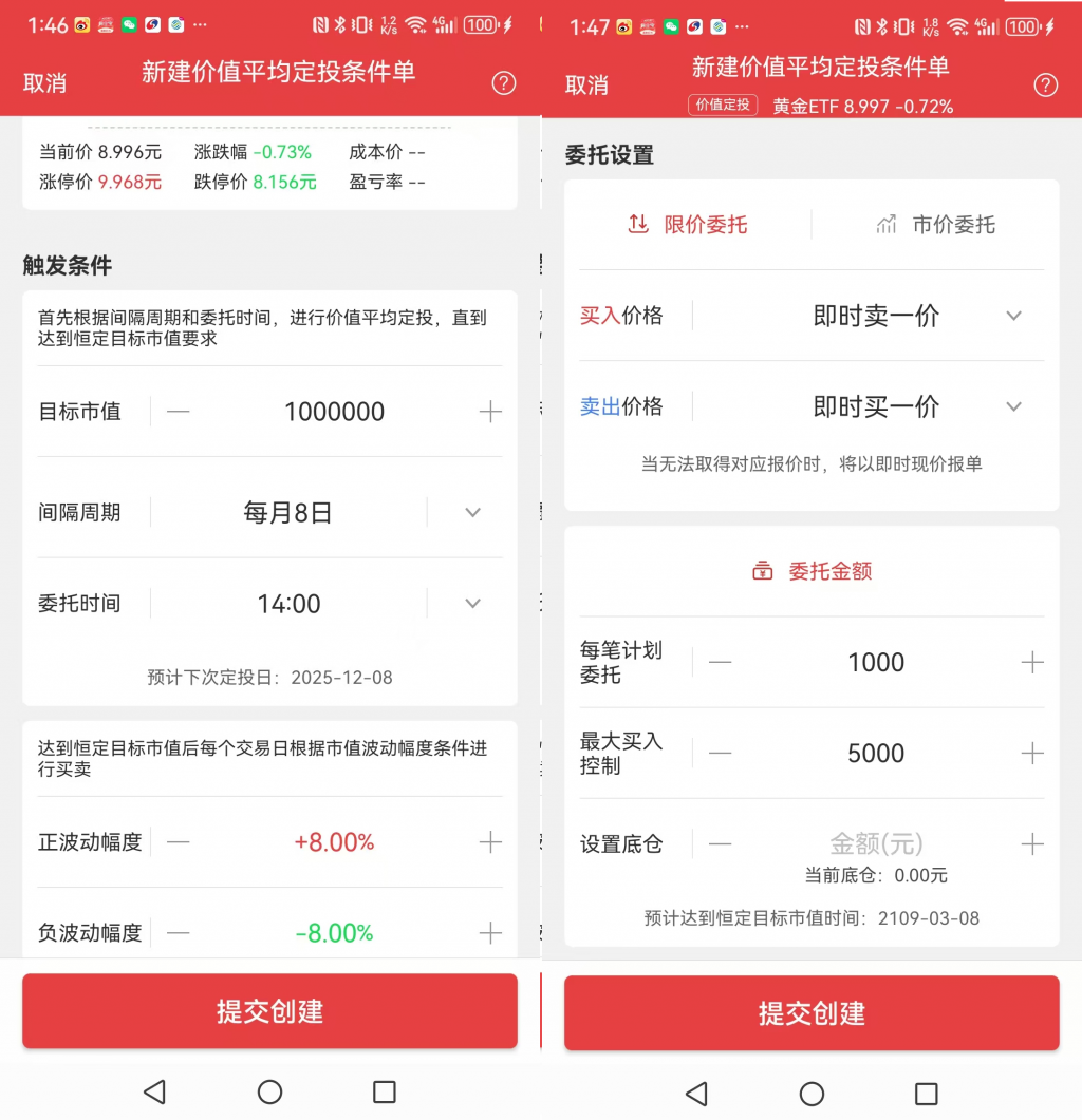 当时我曾经做过一个模板来计算定投金额,现在有券商能自动完成,比如华宝的价值平均定投(在智投-ETF专区-ETF定投-价值平均定投),一次设定后下次开始就会到点自动定投,而且会自动涨了少投,跌了多投: