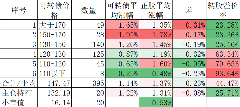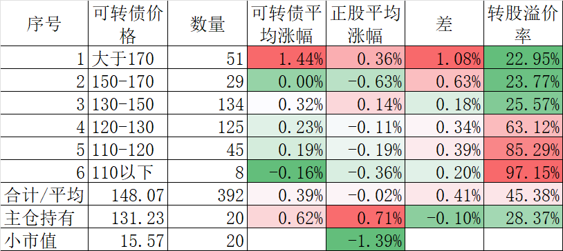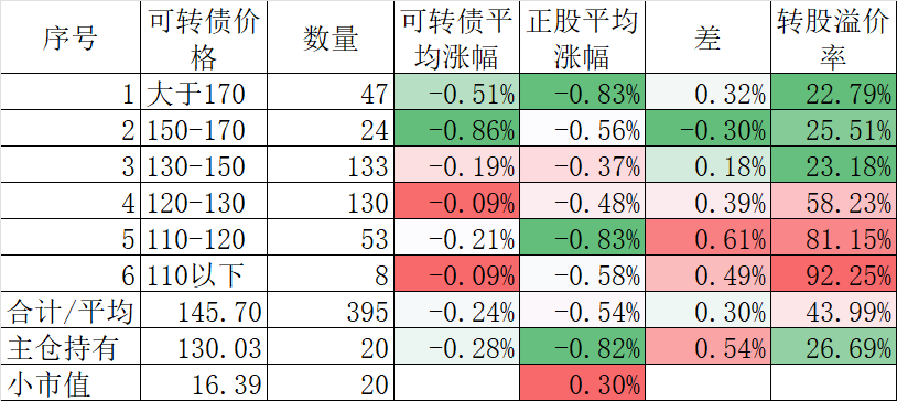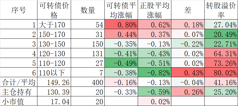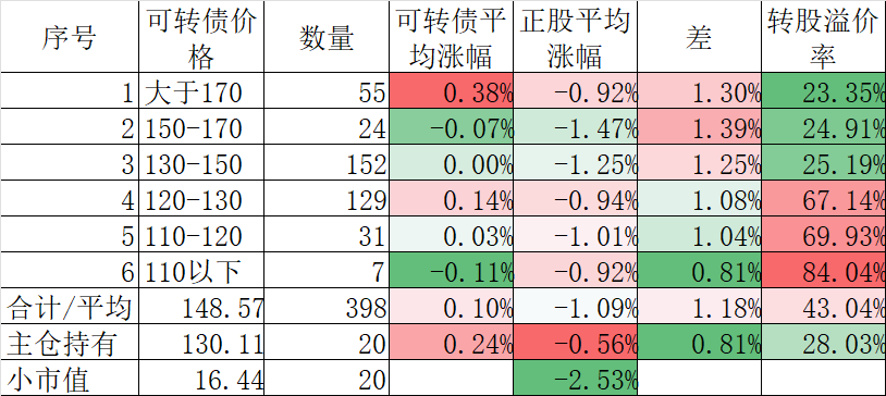 400只可转债平均下跌0.31%,对应正股平均下跌0.77%。我的主仓20只可转债平均下跌0.10%,对应正股平均下跌0.59%。