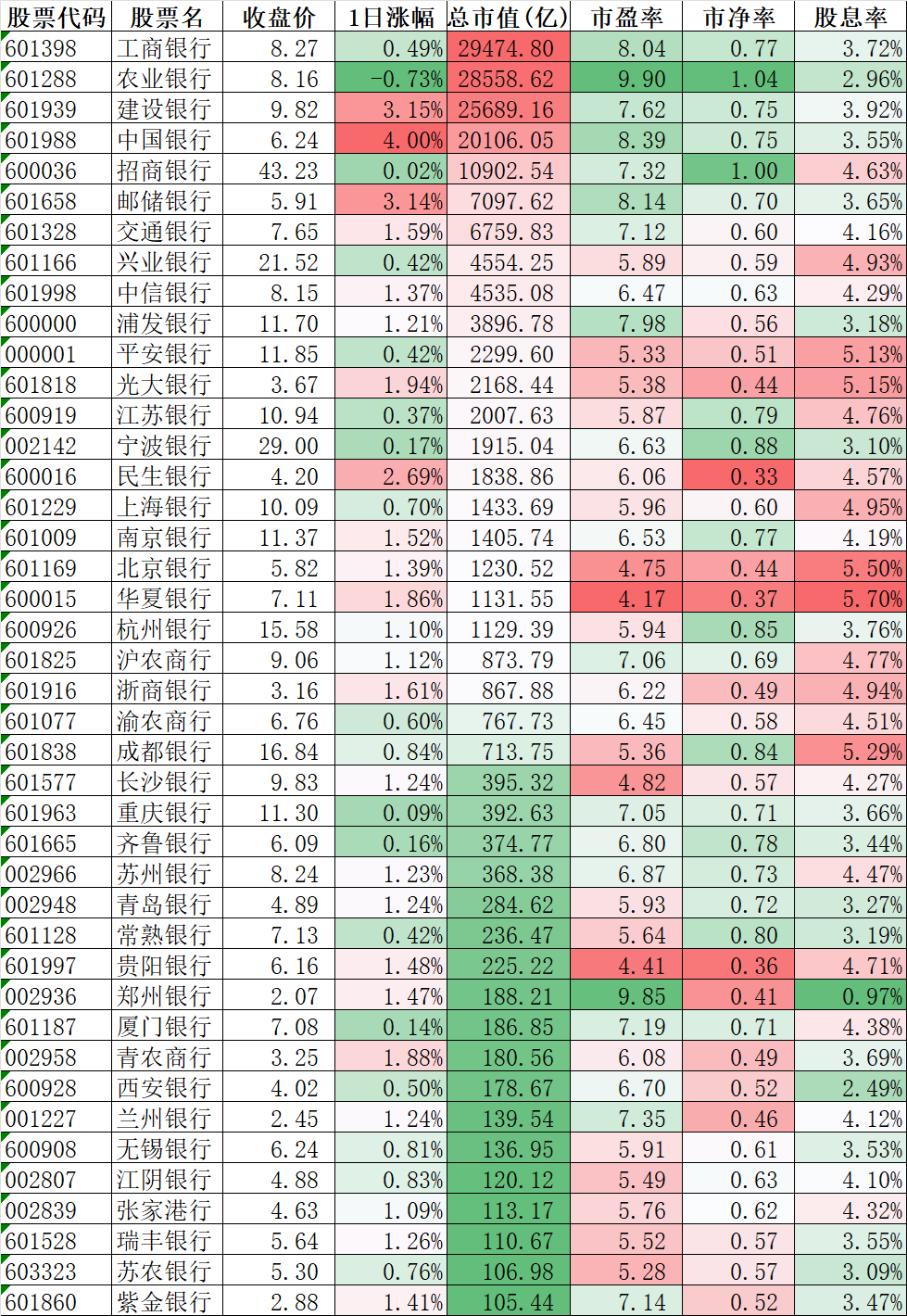 申万一级行业指数中领涨的钢铁涨1.59%、农林牧渔涨1.59%、商贸零售涨1.46%;领跌的银行跌0.83%、煤炭跌0.14%。银行还是领跌。