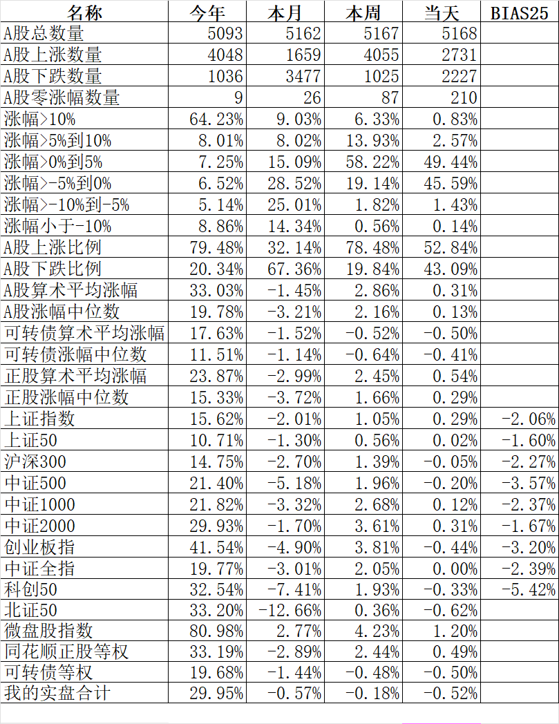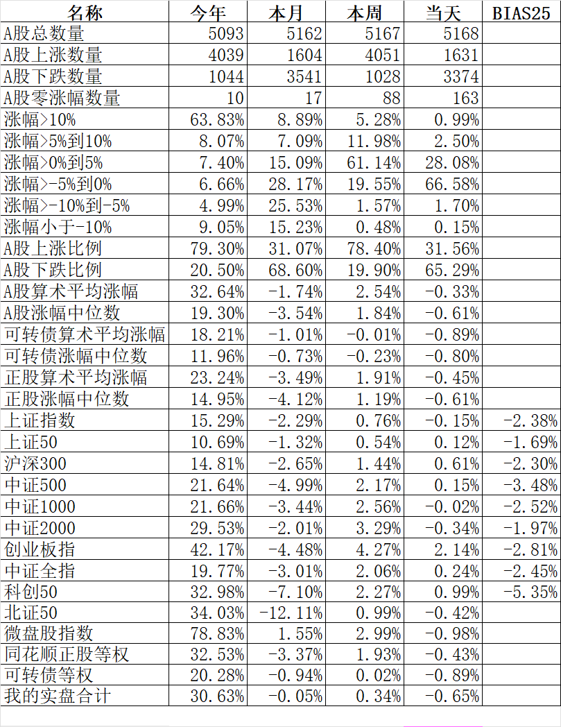 虽然今天的操作有超额,但还是亏损,而且连亏了3天。今天虽然大部分个股是下跌的,但大部分指数却是上涨的。正是应了李清照的词:“知否知否,应是绿肥红瘦?”