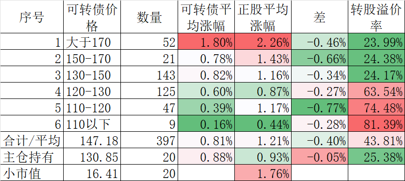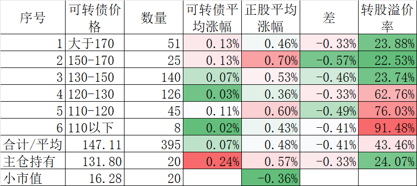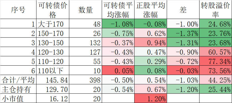 402只可转债平均下跌0.12,对应正股平均上涨0.05%。我的主仓20只可转债平均上涨0.02%,对应正股平均上涨0.36%。