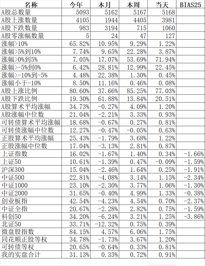 395只可转债平均上涨0.07%,对应正股平均上涨0.48%。我的20只可转债平均上涨0.24%,对应正股平均上涨0.57%。