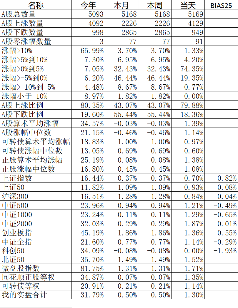 402只可转债平均上涨0.52%,对应正股平均上涨0.74%。我的主仓20只可转债平均上涨1.19%,对应正股平均上涨1.63%。