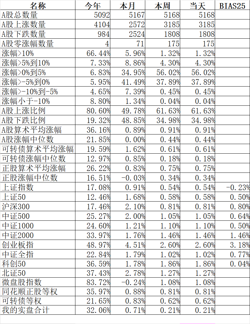 上了4000点,这个慢牛够慢的。今天大部分指数普跌,只有北证50和微盘股是上涨的。 主流宽基指数中领涨的北证50涨0.19%、微盘股指数涨0.12%;领跌的科创50跌1.47%、创业板指跌0.51%。申万一级行业指数中领涨的基础化工涨2.39%、综合涨1.45%、石油石化涨1.38%;领跌的计算机跌1.83%、电子跌1.34%、家用电器跌1.17%。2032只个股上涨,2953只个股下跌,涨幅中...结果是过程带来的 需要每个月识别有效机会并抓住,但很多机会好买点只有几分钟。机会其实还是蛮难识别的。目前转债机会感觉少很多。交易量一直七百左右。还是科技股回调时候机会更多。