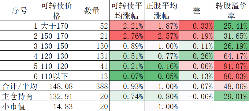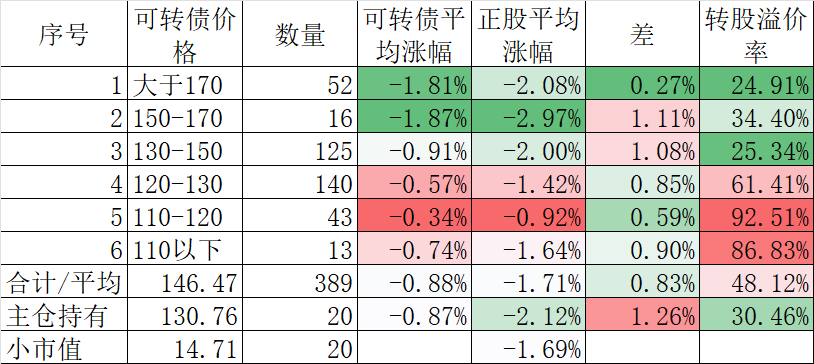 400只可转债平均下跌0.16%,对应正股平均下跌0.13%。我的主仓20只可转债平均下跌0.33%,对应正股平均下跌0.59%。