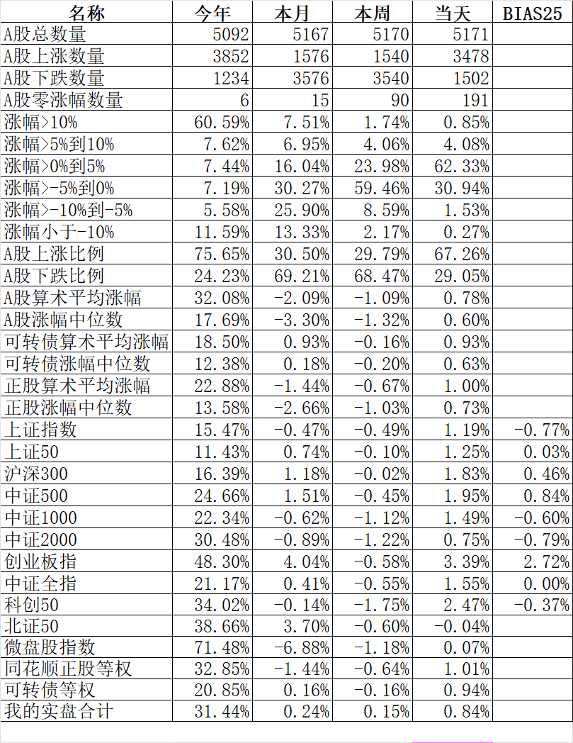 402只可转债平均下跌0.06%,对应正股平均上涨0.13%。我的主仓20只可转债平均下跌0.01%,对应正股平均下跌0.32%。