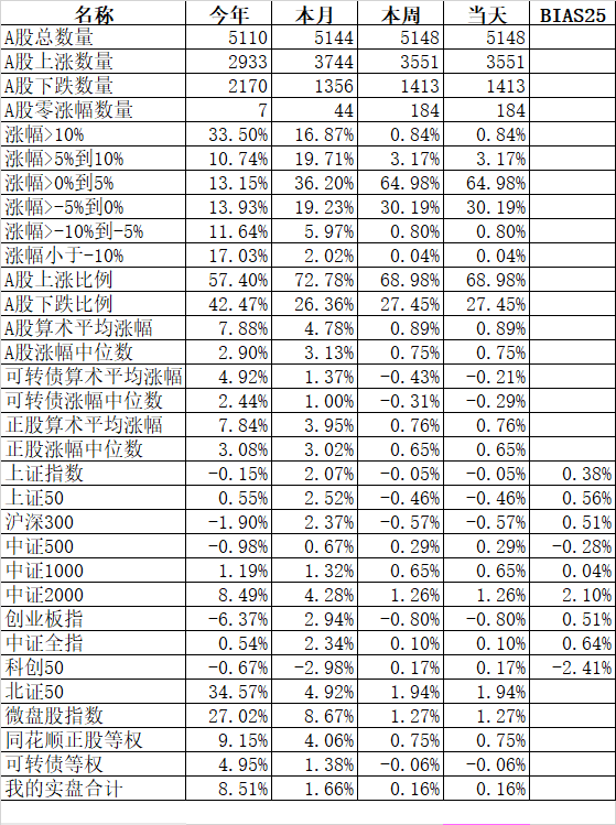 4007只个股上涨、1048只个股下跌,涨幅中位数1.35%。