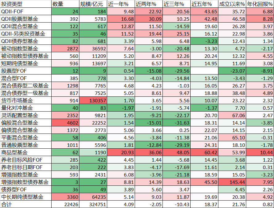 从最近1年的表现来看,表现最好的商品型基金上涨了20.93%,我看了一下明细,基本上都是黄金。其次是QDII股票型基金,平均上涨了16.68%,基本上是美股基金。规模最大的货币基金平均收益率1.70%,也算是中规中矩,被动指数型基金7.64%,而偏股混合型基金平均只有1.54%,真的是差强人意。表现最差的唯一下跌的是量化对冲基金,最近1年平均下跌了1.97%。听上去高大上的基金,实际表现却背道而驰。
