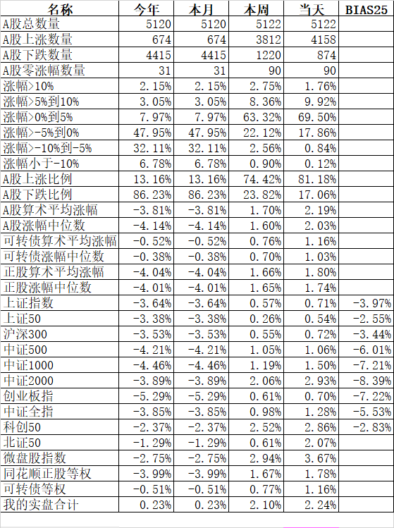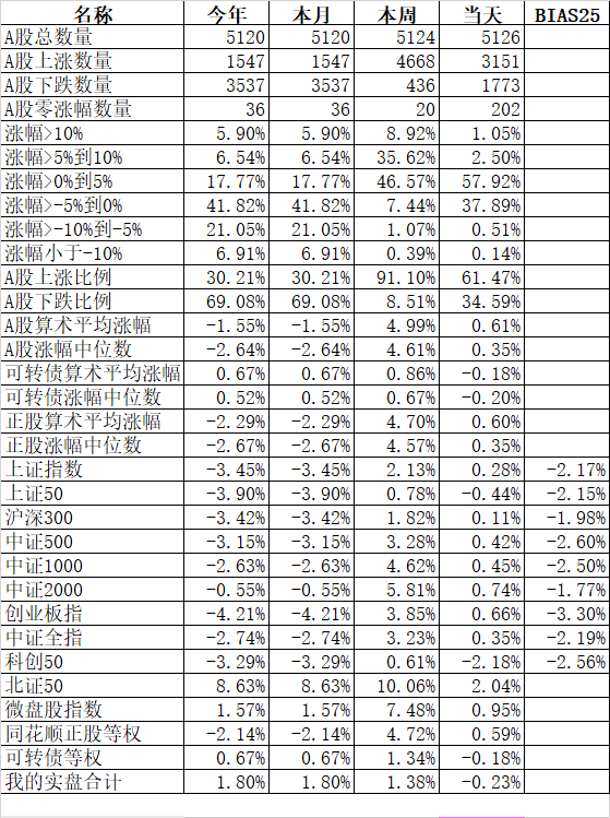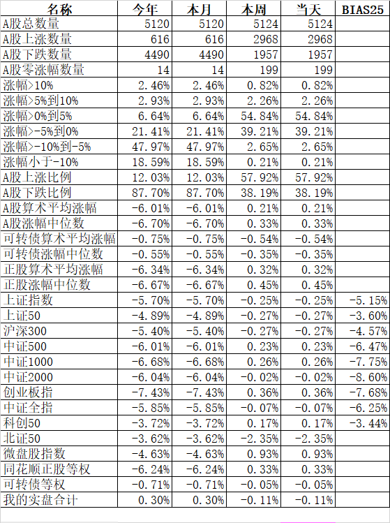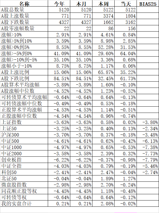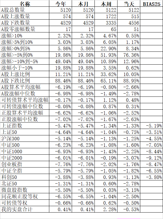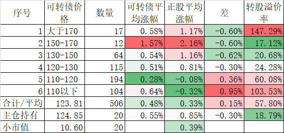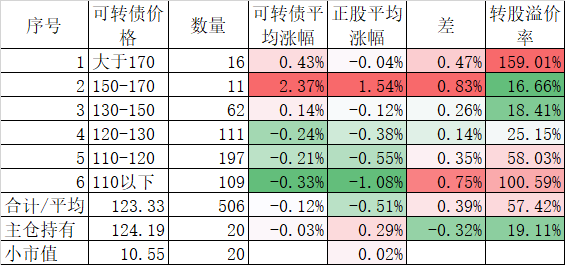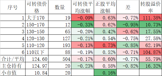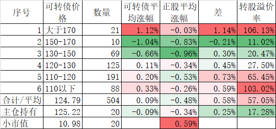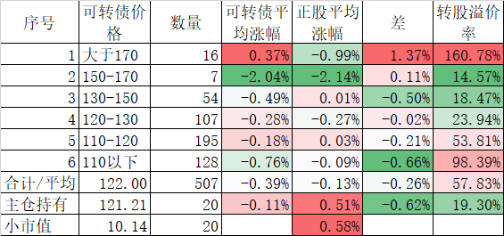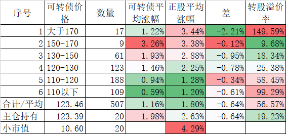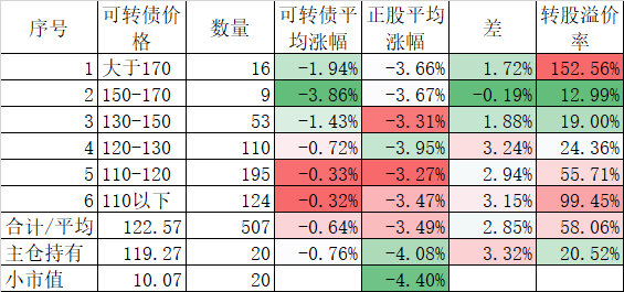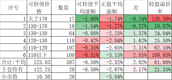 507只可转债平均下跌0.64%,对应正股平均下跌3.49%;我的主仓20只可转债平均下跌0.76%,对应正股平均下跌4.08%。账户合计实际平均下跌0.89%。