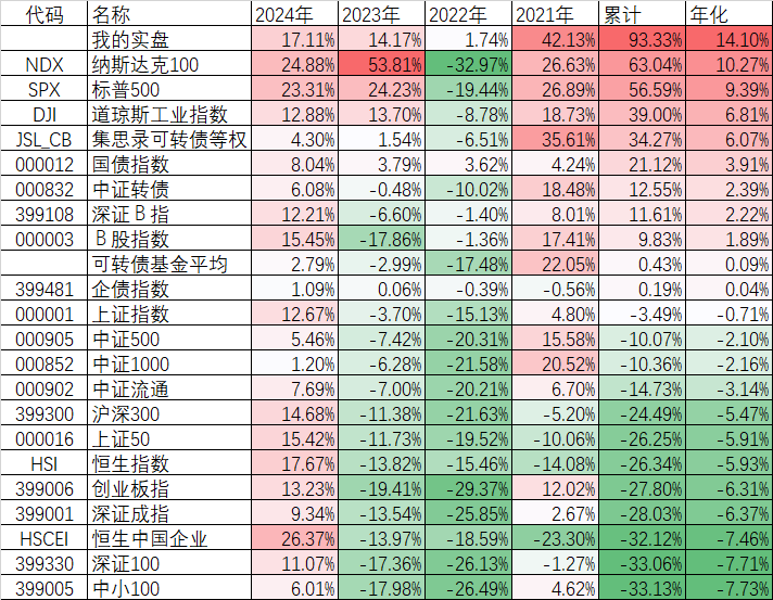 从2021年开始做可转债以来已经4年了,对比可转债等权指数、可转债基金和纳指100等参照,都是跑赢了: