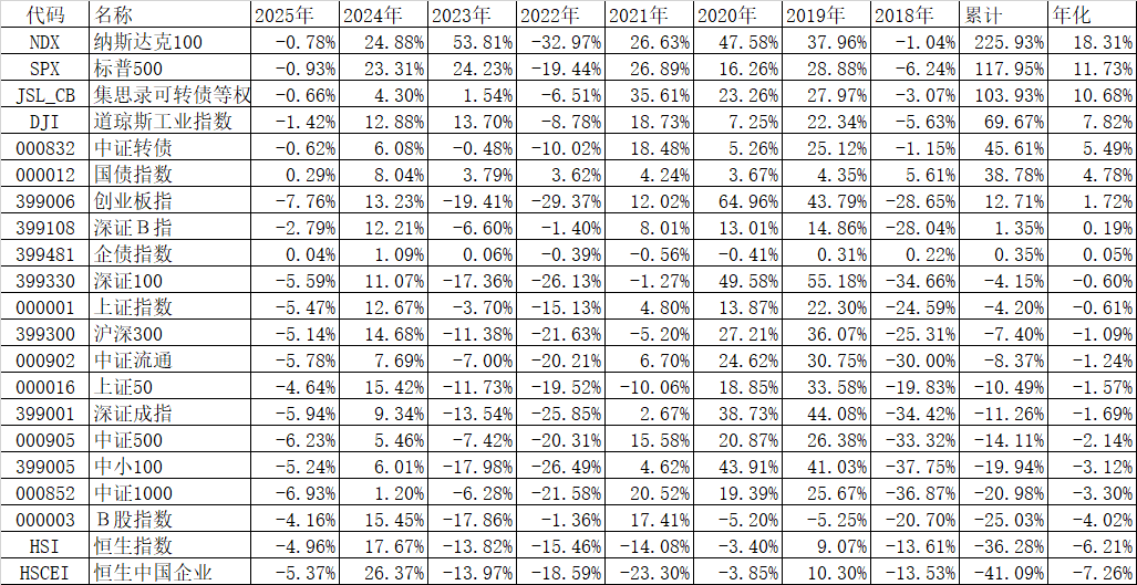 它跑赢了道指和几乎所有的A股和港股的主流宽基指数,和纳指相比,我们小散通过量化轮动等策略,每年可以非常轻松的跑赢可转债等权指数,而你要想跑赢纳指100和标普500,比登天还难。
