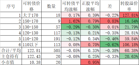 507只可转债平均下跌0.63%,对应正股平均下跌2.19%;我的主仓20只可转债平均下跌0.98%,对应正股平均下跌2.25%。账户合计实际下跌0.95%。