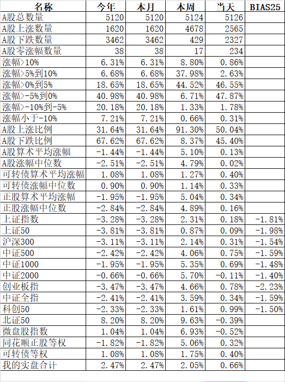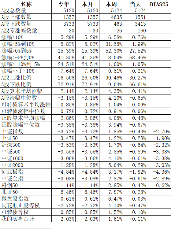 昨天可转债上涨不如大部分指数,今天可转债下跌也小于大部分指数。但一来一去,可转债等权指数本周两天只有跌了0.51%,小于绝大部分指数的跌幅,我的实盘通过优选可转债,跌幅更小,2天只跌了0.07%。充分体现出可转债这个品种特别是在震荡市里的优势。