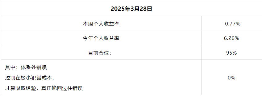 (2)目前持仓中,防御仓位很多,但本周效果很不理想,在上涨中反而逆势下跌,个别标的仓位打太重了,下周我想优化一下,①恢复基仓+波动仓的方式,②恢复滚小利的模式,③严控仓位上限和下限,兼顾运气(热点或热牛)简单说就是围绕当下现金选择权及时收割,严控基础仓位上限以避雷,严控基础仓位下限不丢仓,波动仓滚动吃波动,被动应对。这样大概率胜率是无忧的,只是可能少赚。